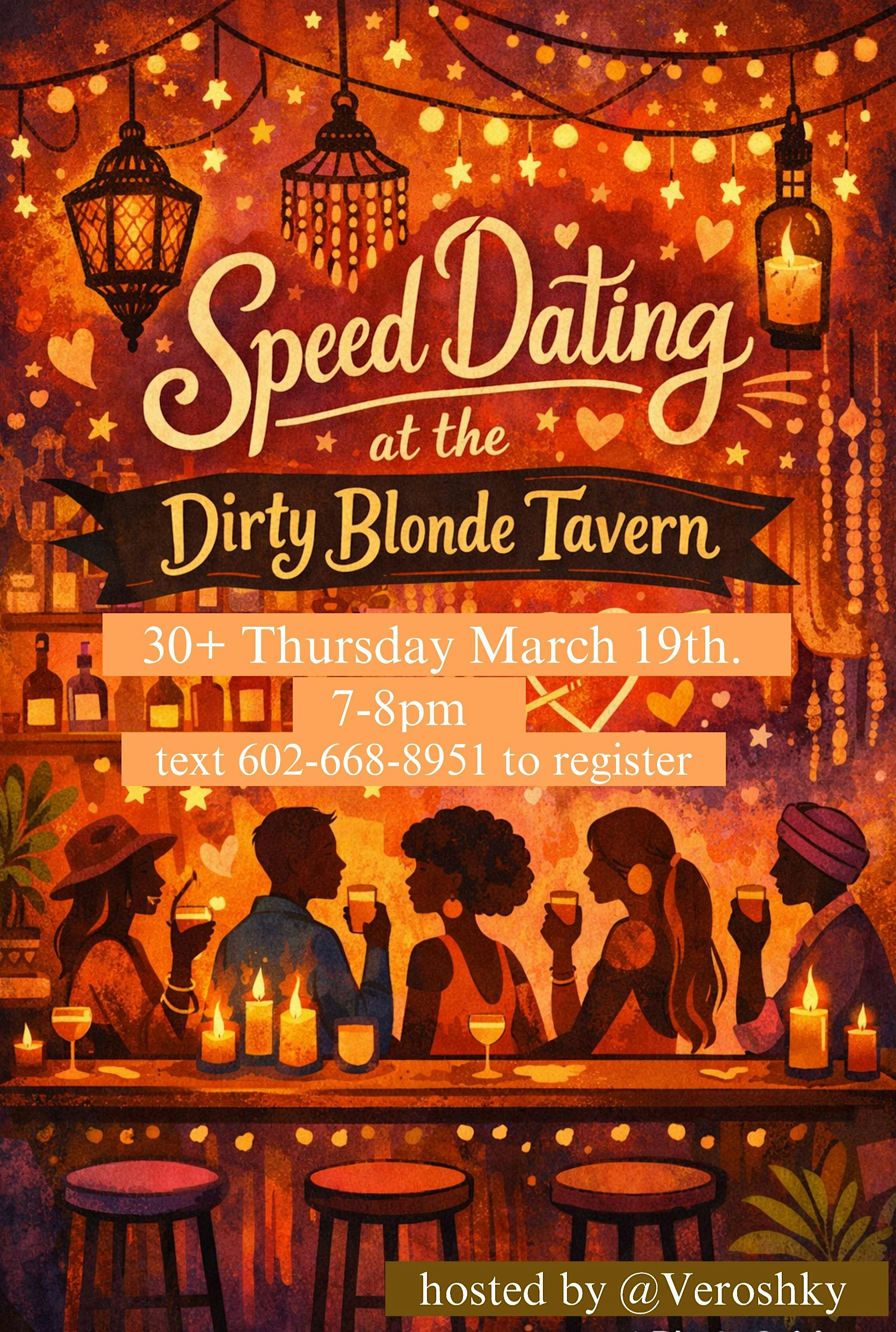 by admin13Feb SPEED DATING 30+ in Chandler (guy’s tickets) at Dirty Blonde Tavern – Chandler, AZ SPEED DATING 30+ in Chandler (guy’s tickets) at Dirty Blonde Tavern – Chandler, AZ 1 1 people viewed this event. Meet new girls 30+ in Chandler for a fun, relaxed night of speed dating and good vibes! Tickets-RSVP Link Date And Time Friday, March 20th, 2026 02:00 AM (PST) Venue Dirty Blonde Tavern Location 4929 West Chandler Boulevard, Chandler, AZ 85226 Event Types Community & CultureParty or Social Gathering Event Category Arizona Share With Friends Facebook Twitter Linkedin Xing Pinterest Share This Post: