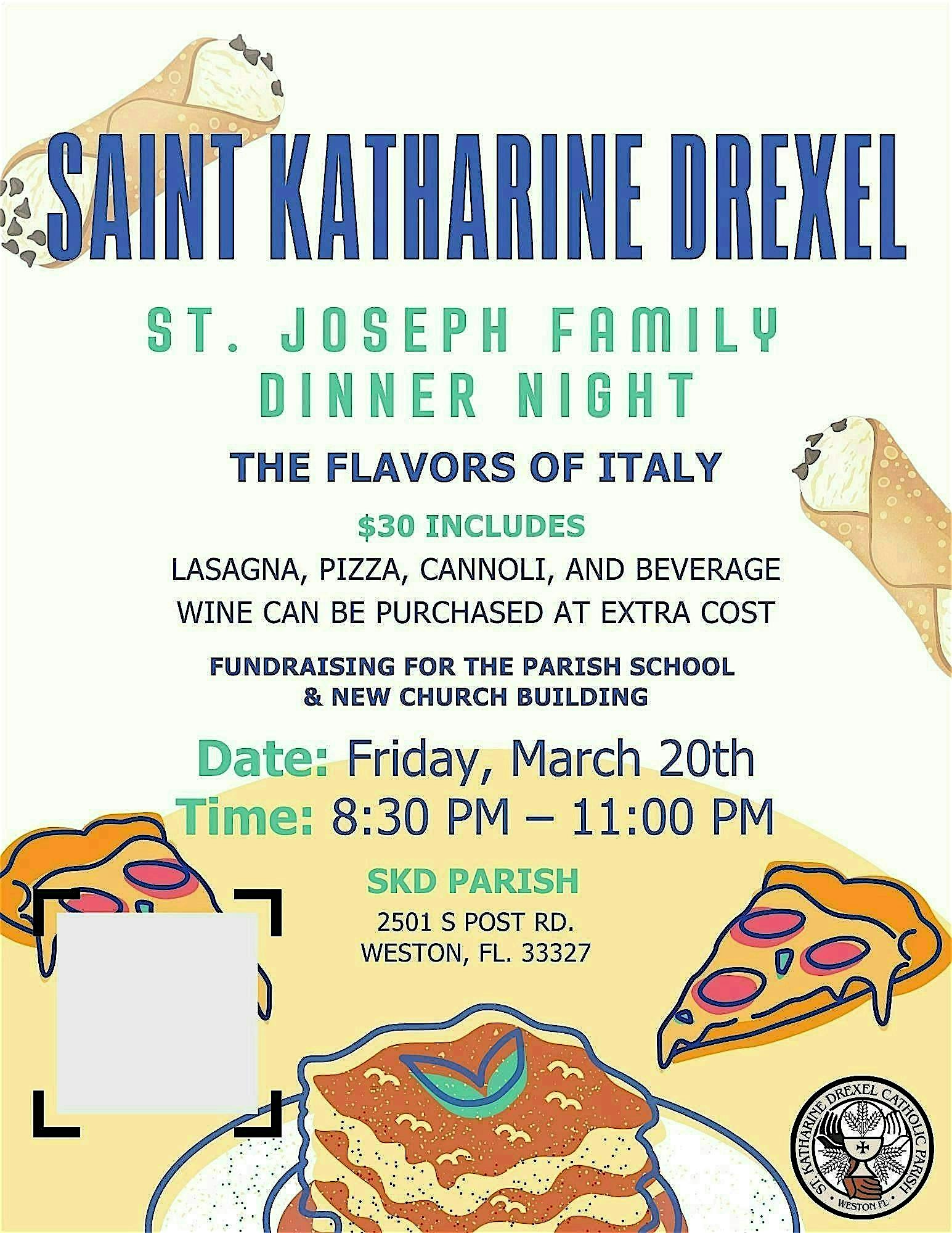 by admin24Feb ST. JOSEPH FAMILY DINNER NIGHT – THE FLAVORS OF ITALY at 2501 S Post Rd – Weston, FL ST. JOSEPH FAMILY DINNER NIGHT – THE FLAVORS OF ITALY at 2501 S Post Rd – Weston, FL 2 2 people viewed this event. St. Katharine Drexel invites you to join us for a delicious evening filled with the best Italian dinner – it’s going to be molto delizioso! Tickets-RSVP Link Date And Time Friday, March 20th, 2026 08:00 PM (PST) Venue 2501 S Post Rd Location 2501 South Post Road, Weston, FL 33327 Event Types Food & Drink Event Category FloridaFt Lauderdale Share With Friends Facebook Twitter Linkedin Xing Pinterest Share This Post: