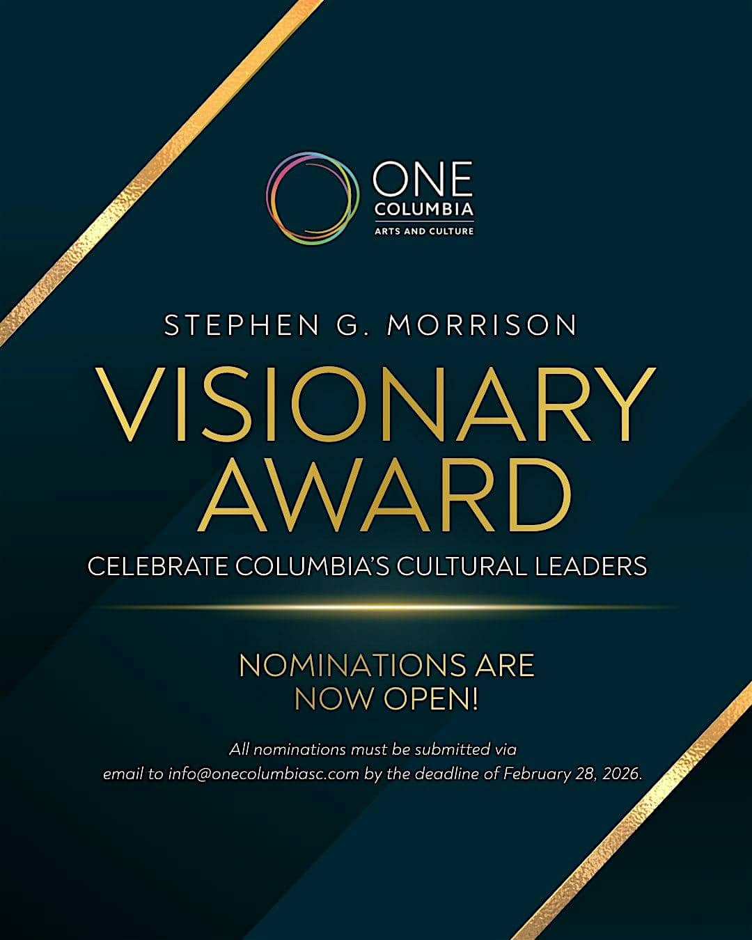by admin23Feb Stephen G. Morrison Award 2026 at Koger Center for the Arts – Columbia, SC Stephen G. Morrison Award 2026 at Koger Center for the Arts – Columbia, SC 1 1 people viewed this event. Join One Columbia for Arts and Culture as we celebrate a monumental evening dedicated to vision, leadership, and the arts. Tickets-RSVP Link Date And Time Friday, March 20th, 2026 06:00 PM (PST) Venue Koger Center for the Arts Location 1051 Greene Street, Columbia, SC 29201 Event Types Community & CultureParty or Social Gathering Event Category South Carolina Share With Friends Facebook Twitter Linkedin Xing Pinterest Share This Post: