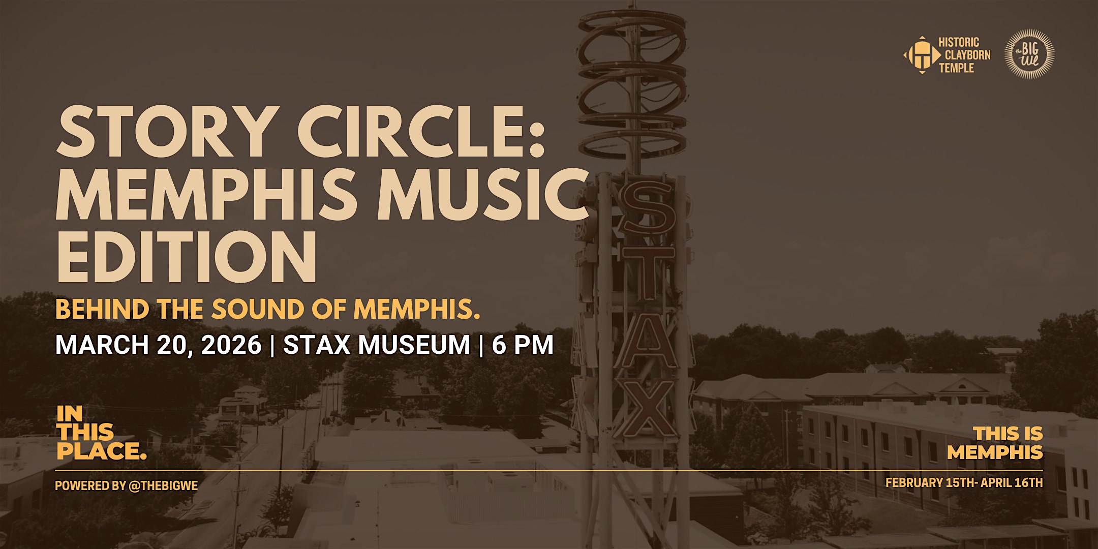 by admin13Feb Story Circle: Memphis Music Edition- In This Place 2026 at Stax Museum of American Soul Music – Memphis, TN Story Circle: Memphis Music Edition- In This Place 2026 at Stax Museum of American Soul Music – Memphis, TN 1 1 people viewed this event. Love Memphis music? Join us at Stax for stories behind the songs, guided listening, and a night celebrating the sound of our city. Tickets-RSVP Link Date And Time Friday, March 20th, 2026 11:00 PM (PST) Venue Stax Museum of American Soul Music Location 926 East McLemore Avenue, Memphis, TN 38106 Event Types Music Event Category MemphisTennessee Share With Friends Facebook Twitter Linkedin Xing Pinterest Share This Post: