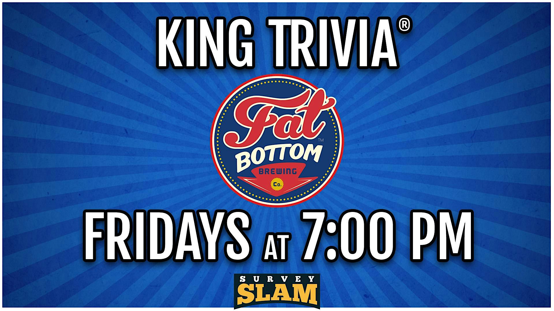 Survey Slam at Fat Bottom Brewing at Fat Bottom Brewing Co. – Nashville, TN Survey Slam at Fat Bottom Brewing at Fat Bottom Brewing Co. – Nashville, TN 2 2 people viewed this event. Your host asks players fun and silly survey questions and your teams try to guess the most popular surveyed answers! Tickets-RSVP Link Register for event Date And Time Friday, March 20th, 2026 @ 07:00 PM Location 800 44th Avenue North, Nashville, TNĀ 37209 Event Types Food & DrinkGame or Competition Event Category NashvilleTennessee Share With Friends Facebook Twitter Linkedin Xing Pinterest