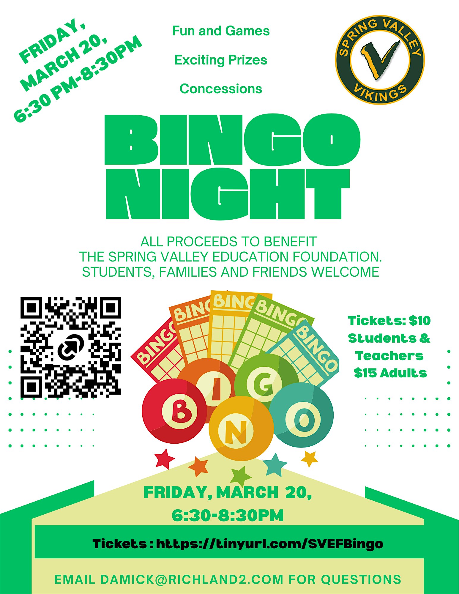 by admin13Feb SVEF Family Bingo Night at Spring Valley High School – Columbia, SC SVEF Family Bingo Night at Spring Valley High School – Columbia, SC 1 1 people viewed this event. Join us for a fun-filled SVEF Family Bingo Night with prizes, snacks, and lots of laughs! Tickets-RSVP Link Date And Time Friday, March 20th, 2026 10:00 PM (PST) Venue Spring Valley High School Location 120 Sparkleberry Lane, Columbia, SC 29229 Event Types Party or Social Gathering Event Category South Carolina Share With Friends Facebook Twitter Linkedin Xing Pinterest Share This Post: