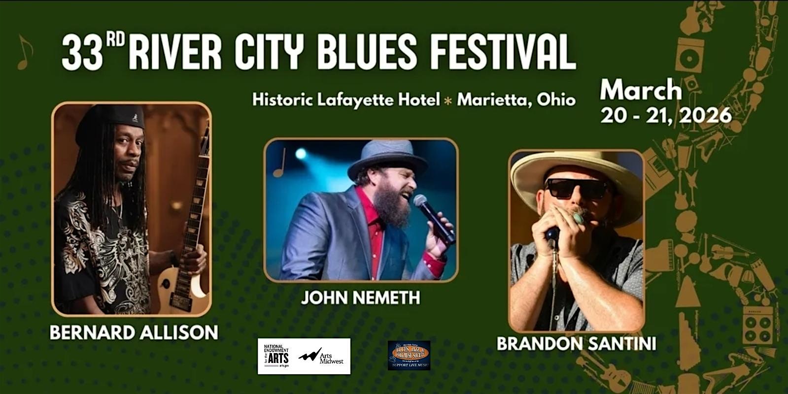 by admin13Feb The 33rd River City Blues Festival at Historic Lafayette Hotel – Marietta, OH The 33rd River City Blues Festival at Historic Lafayette Hotel – Marietta, OH 1 1 people viewed this event. Get ready to groove at the 33rd River City Blues Festival, where the blues flow and the good times roll on March 20 & 21, 2026. Tickets-RSVP Link Date And Time Friday, March 20th, 2026 09:00 PM (PST) Venue Historic Lafayette Hotel Location 101 Front Street, Marietta, OH 45750 Event Types Concert or PerformanceMusic Event Category Ohio Share With Friends Facebook Twitter Linkedin Xing Pinterest Share This Post: