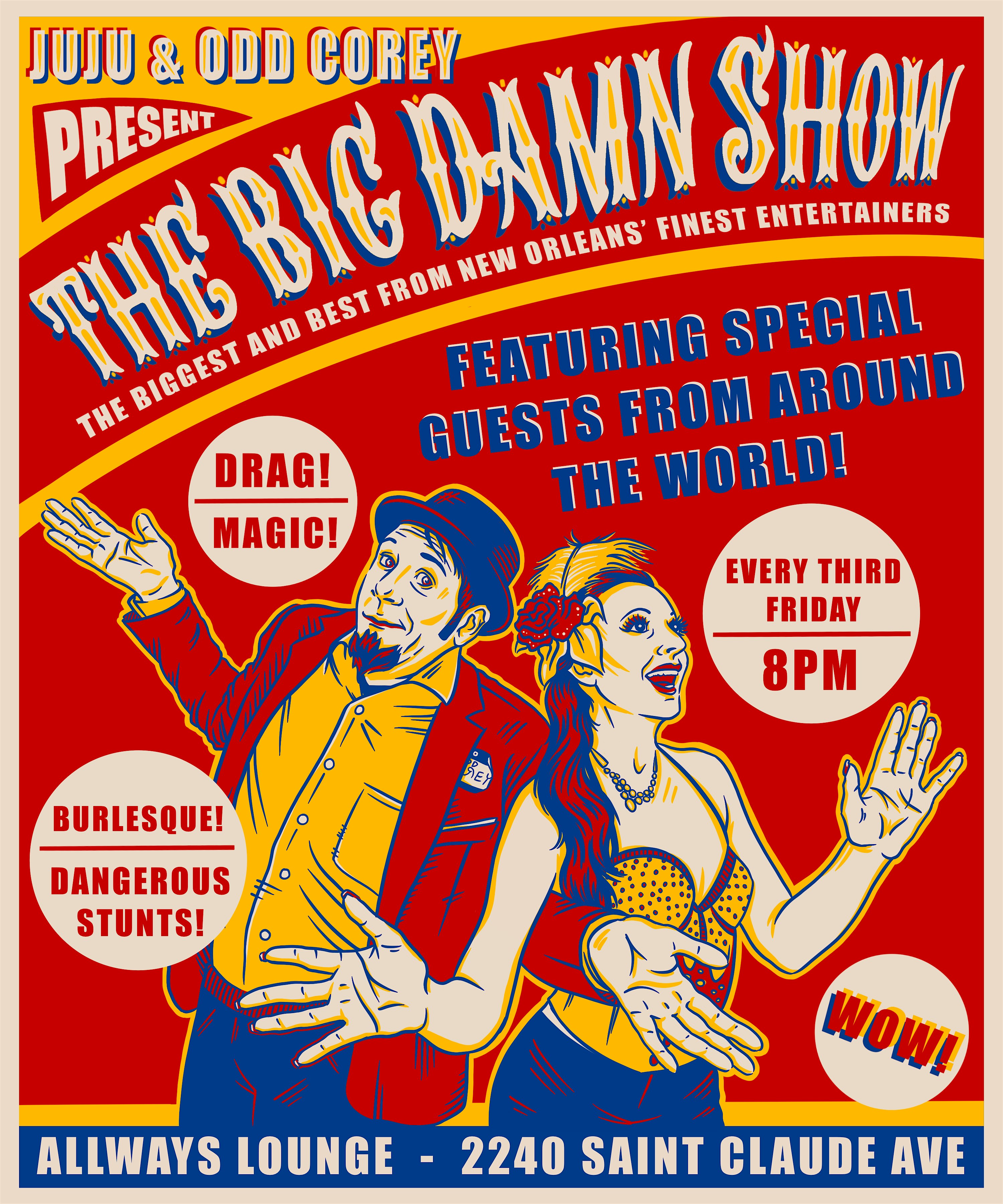by admin05Mar The Big Damn Show at The AllWays Lounge & Cabaret – New Orleans, LA The Big Damn Show at The AllWays Lounge & Cabaret – New Orleans, LA 2 2 people viewed this event. New Orleans’ #1 comedy thrill-show featuring nationally recognized Drag & Burlesque artists, Magic Illusions,circus acts & sideshow stunts! Tickets-RSVP Link Date And Time Friday, March 20th, 2026 08:00 PM (PST) Venue The AllWays Lounge & Cabaret Location 2240 Saint Claude Avenue, New Orleans, LA 70117 Event Types Concert or PerformancePerforming & Visual Arts Event Category LouisianaNew Orleans Share With Friends Facebook Twitter Linkedin Xing Pinterest Share This Post: