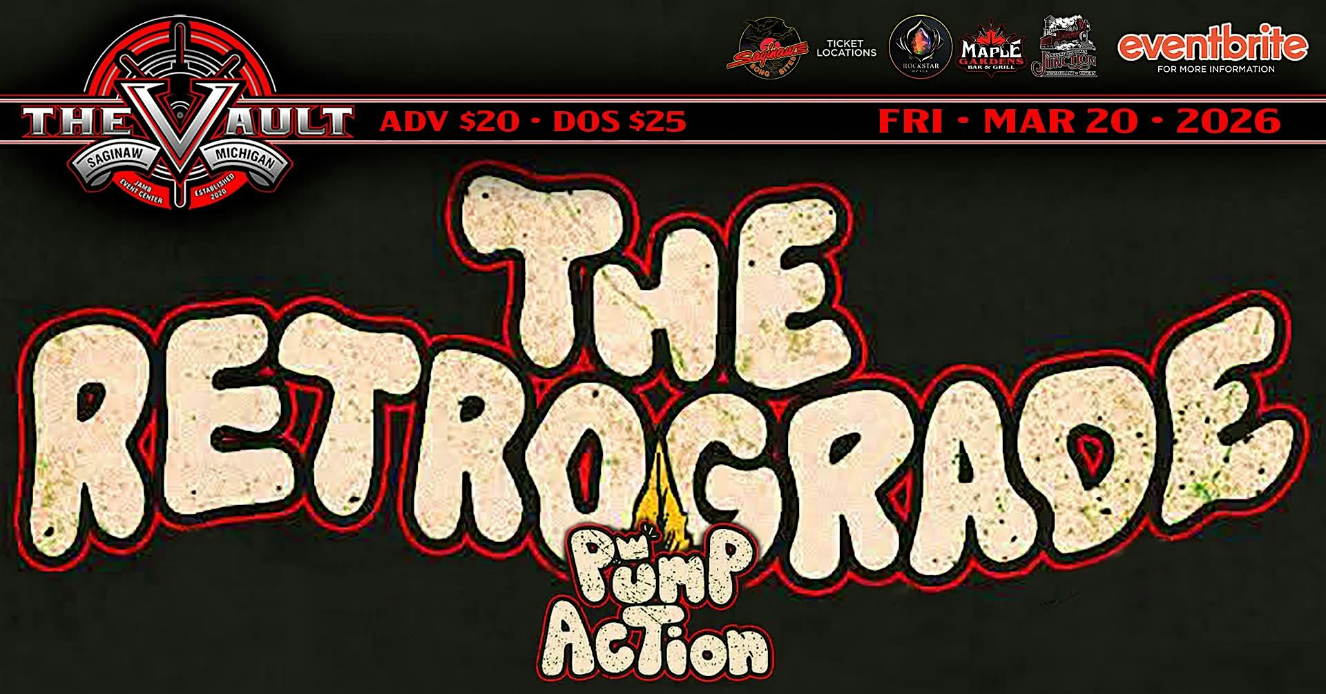 by admin13Feb THE RETROGRADE and PUMP ACTION at The VAULT – Saginaw, MI THE RETROGRADE and PUMP ACTION at The VAULT – Saginaw, MI 1 1 people viewed this event. THE RETROGRADE and PUMP ACTION Tickets-RSVP Link Date And Time Friday, March 20th, 2026 11:00 PM (PST) Venue The VAULT Location 110 Florence Street, Saginaw, MI 48602 Event Types Concert or PerformanceMusic Event Category Michigan Share With Friends Facebook Twitter Linkedin Xing Pinterest Share This Post: