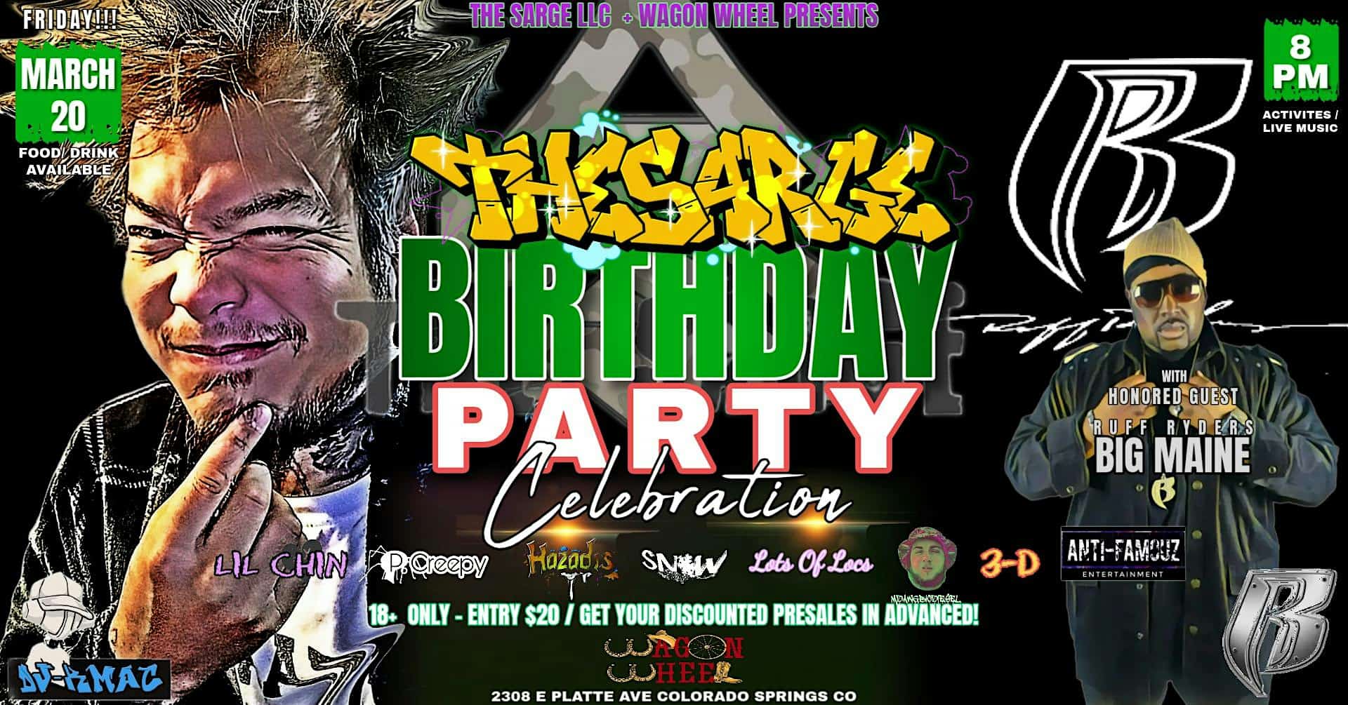 by admin23Feb THE SARGE BIRTHDAY BASH at Wagon Wheel Sports Bar & Concert Hall – Colorado Springs, CO THE SARGE BIRTHDAY BASH at Wagon Wheel Sports Bar & Concert Hall – Colorado Springs, CO 2 2 people viewed this event. Sarge’s Birthday Bash! Big Maine + MHX reunion, classic acts return for one night only! March 20 at The Wagon Wheel. 18+ $20 DOS. Tickets-RSVP Link Date And Time Friday, March 20th, 2026 08:00 PM (PST) Venue Wagon Wheel Sports Bar & Concert Hall Location 2308 East Platte Avenue, Colorado Springs, CO 80909 Event Types Concert or PerformanceMusic Event Category ColoradoColorado Springs Share With Friends Facebook Twitter Linkedin Xing Pinterest Share This Post: