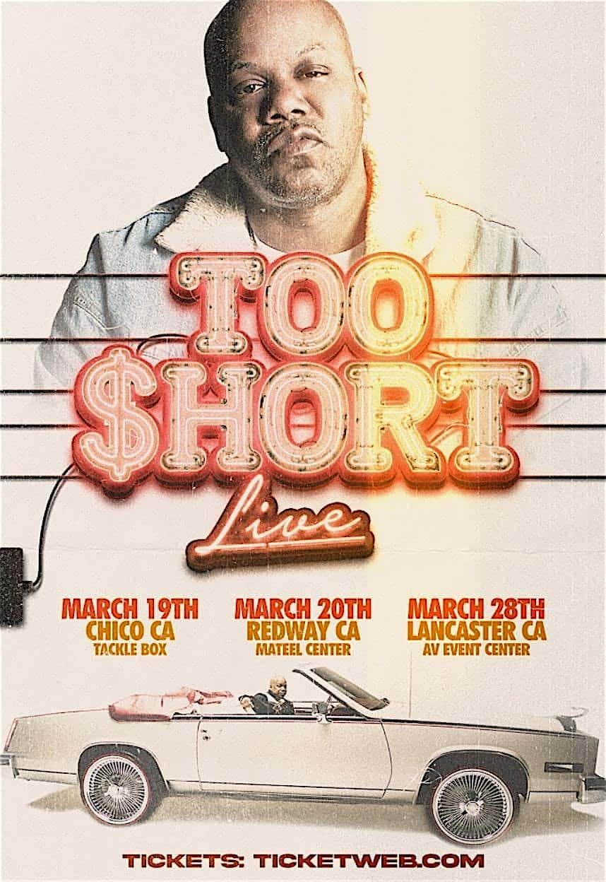 by admin23Feb Too Short Live Humboldt at Mateel Community Center – Redway, CA Too Short Live Humboldt at Mateel Community Center – Redway, CA 1 1 people viewed this event. Catch Too Short live in Humboldt for a night full of vibes, beats, and unforgettable energy! Tickets-RSVP Link Date And Time Friday, March 20th, 2026 08:00 PM (PST) Venue Mateel Community Center Location 59 Rusk Lane, Redway, CA 95560 Event Types Concert or PerformanceMusic Event Category California Share With Friends Facebook Twitter Linkedin Xing Pinterest Share This Post: