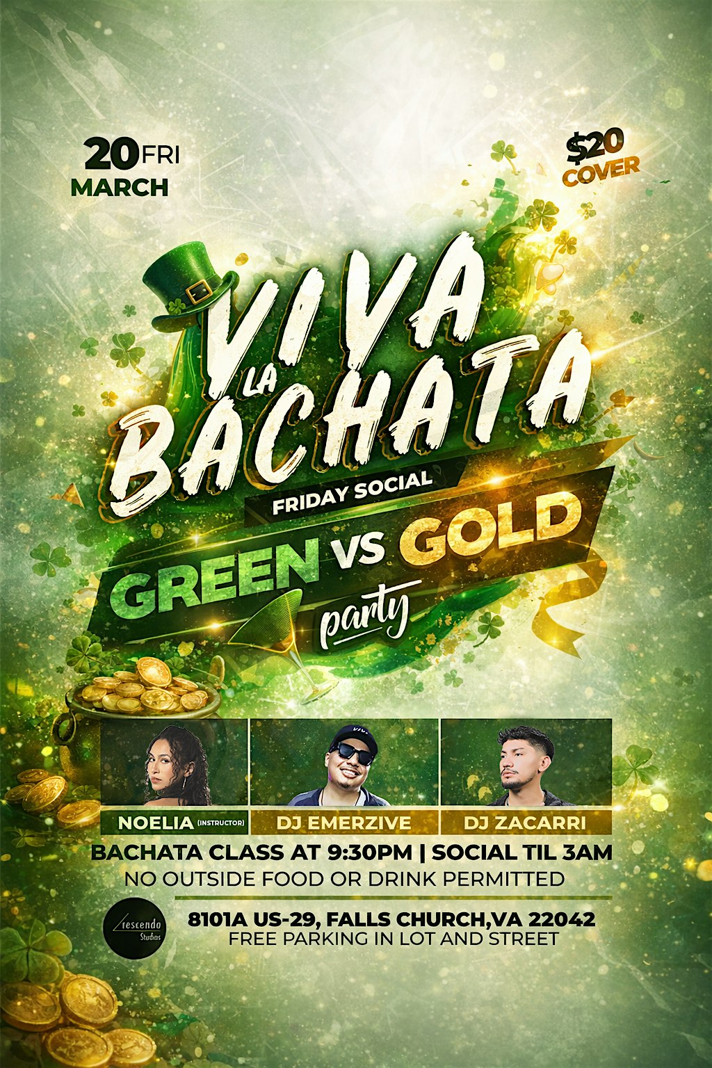 by admin05Mar VIVA LA BACHATA Green vs. Gold party at Crescendo Studios – Falls Church, VA VIVA LA BACHATA Green vs. Gold party at Crescendo Studios – Falls Church, VA 3 3 people viewed this event. Your ideal Bachata social dancing night. Tickets-RSVP Link Date And Time Friday, March 20th, 2026 09:00 PM (PST) Venue Crescendo Studios Location 8101a U.S. 29, Falls Church, VA 22042 Event Types MusicParty or Social Gathering Event Category Virginia Share With Friends Facebook Twitter Linkedin Xing Pinterest Share This Post: