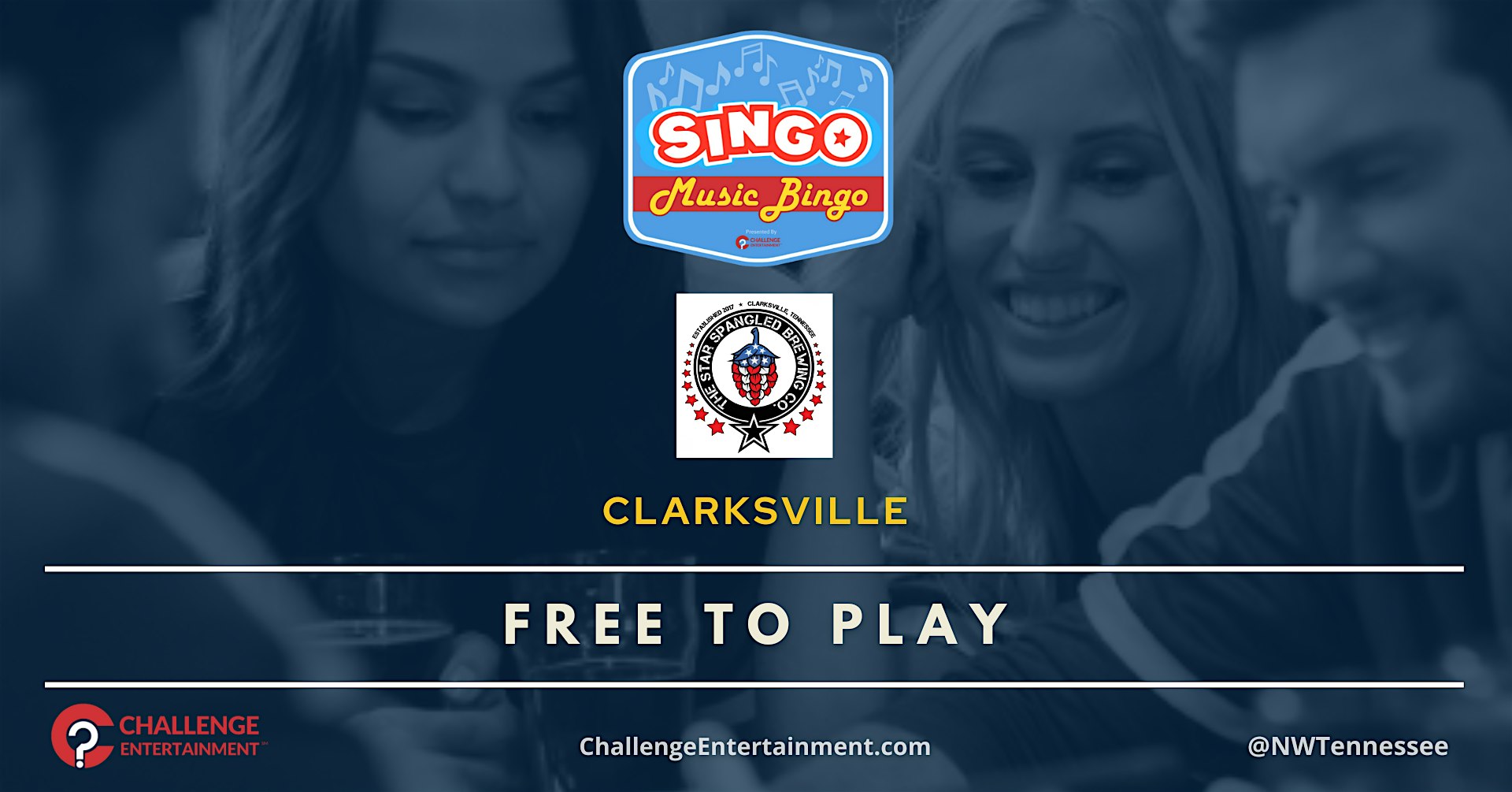 Weekly SINGO Music Bingo Nights at Star Spangled Brewing Co – Clarksville at The Star Spangled Brewing Co. – Clarksville, TN Weekly SINGO Music Bingo Nights at Star Spangled Brewing Co – Clarksville at The Star Spangled Brewing Co. – Clarksville, TN 1 1 people viewed this event. Weekly SINGO Music Bingo Nights at Star Spangled Brewing Co – Clarksville Tickets-RSVP Link Register for event Date And Time Friday, March 20th, 2026 @ 07:00 PM Location 614 North Spring Street, Clarksville, TNĀ 37040 Event Types Game or CompetitionMusic Event Category Tennessee Share With Friends Facebook Twitter Linkedin Xing Pinterest