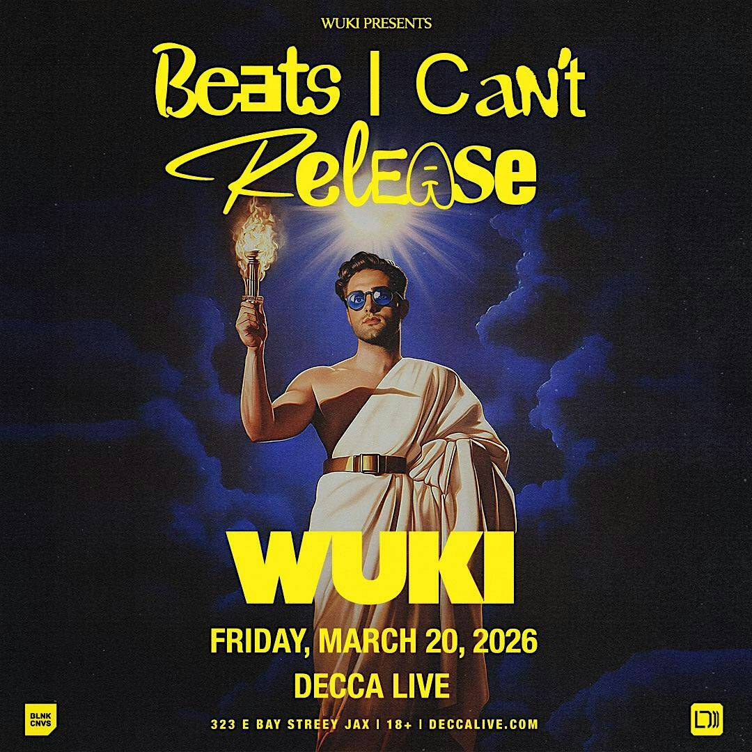 by admin23Feb Wuki – Beats I Can’t Release Tour at Decca Live – Jacksonville, FL Wuki – Beats I Can’t Release Tour at Decca Live – Jacksonville, FL 1 1 people viewed this event. Wuki comes to Jacksonville at Decca Live on March 20th Tickets-RSVP Link Date And Time Friday, March 20th, 2026 10:00 PM (PST) Venue Decca Live Location 323 East Bay Street, Jacksonville, FL 32202 Event Types Music Event Category FloridaJacksonville Share With Friends Facebook Twitter Linkedin Xing Pinterest Share This Post: