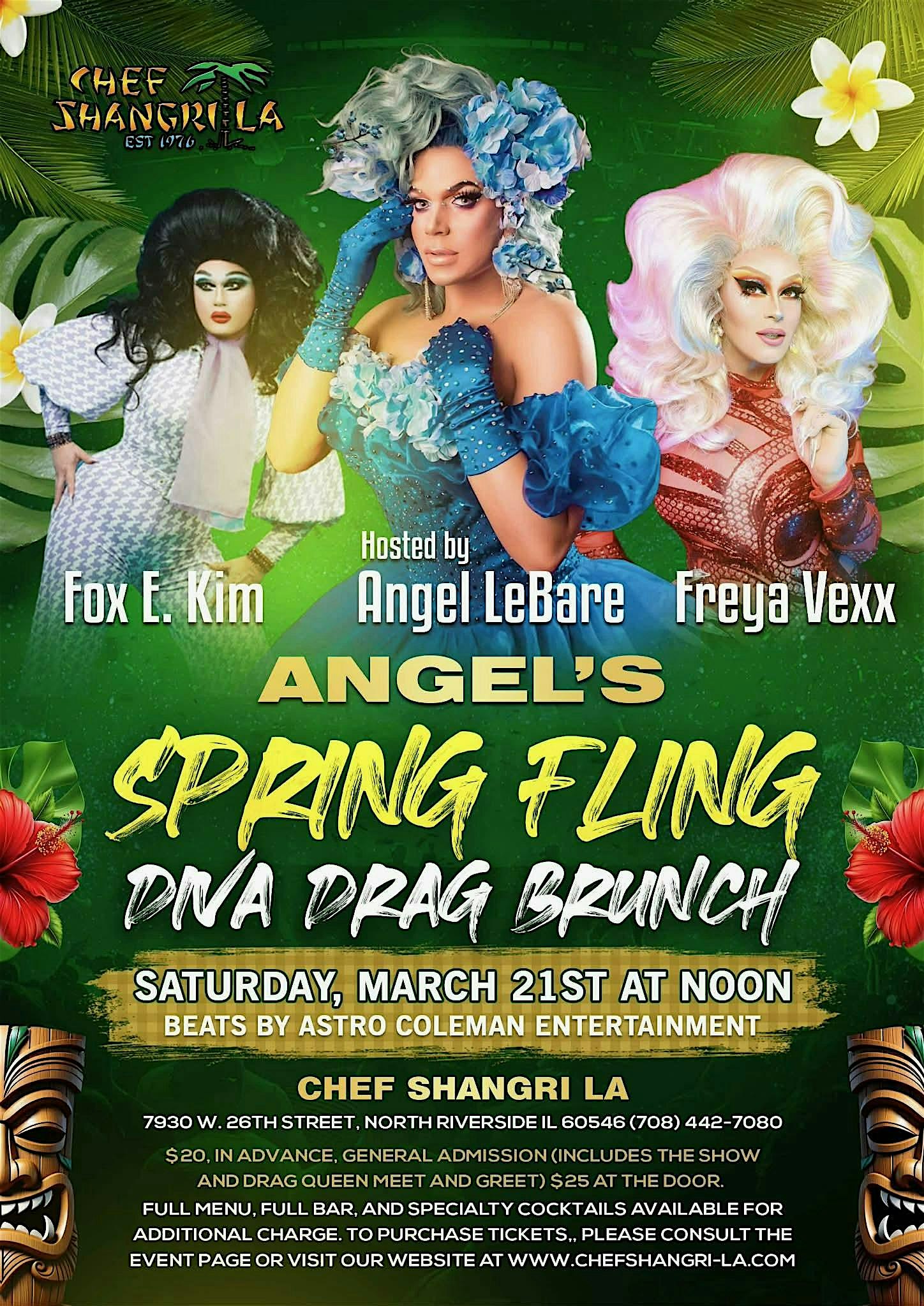 by admin23Feb Angel’s Spring Fling Diva Drag Brunch at Chef Shangri-La – North Riverside, IL Angel’s Spring Fling Diva Drag Brunch at Chef Shangri-La – North Riverside, IL 2 2 people viewed this event. Join us for a fabulous afternoon filled with incredible performances, delicious food, and holiday cheer! Hosted by the amazing Angel LeBare Tickets-RSVP Link Date And Time Saturday, March 21st, 2026 12:00 PM (PST) Venue Chef Shangri-La Location 7930 West 26th Street, North Riverside, IL 60546 Event Types Food & DrinkParty or Social Gathering Event Category Illinois Share With Friends Facebook Twitter Linkedin Xing Pinterest Share This Post:
