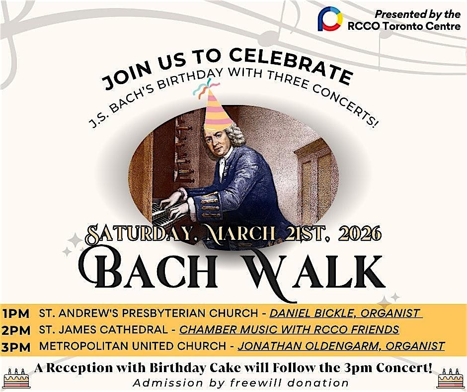 by admin27Feb Bach Walk 2026 at St. Andrew’s Presbyterian Church – Toronto, Canada Bach Walk 2026 at St. Andrew’s Presbyterian Church – Toronto, Canada 1 1 people viewed this event. Join us as we walk from church to church in the core of Toronto to attend exceptional performances of Bach organ and chamber music! Tickets-RSVP Link Date And Time Saturday, March 21st, 2026 01:00 PM (PST) Venue St. Andrew's Presbyterian Church Location 73 Simcoe Street, Toronto, Canada M5J 1W9 Event Types Concert or PerformanceMusic Event Category CanadaToronto Share With Friends Facebook Twitter Linkedin Xing Pinterest Share This Post:
