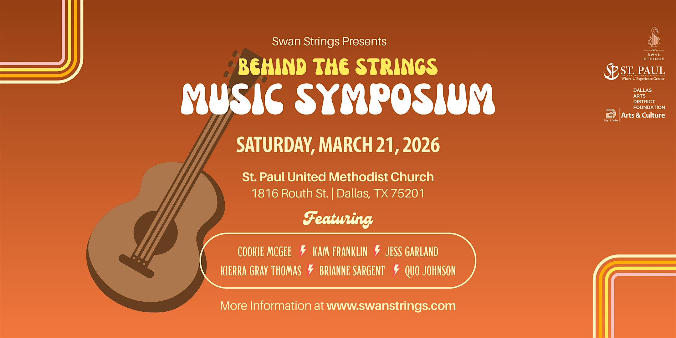 by admin24Feb Behind the Strings: Music Symposium at St. Paul United Methodist Church – Dallas, TX Behind the Strings: Music Symposium at St. Paul United Methodist Church – Dallas, TX 3 3 people viewed this event. Music Symposium Amplifying Black Women in Guitar Culture Presented by Swan Strings Tickets-RSVP Link Date And Time Saturday, March 21st, 2026 12:00 PM (PST) Venue St. Paul United Methodist Church Location 1816 Routh Street, Dallas, TX 75201 Event Types Concert or PerformanceMusic Event Category DallasTexas Share With Friends Facebook Twitter Linkedin Xing Pinterest Share This Post: