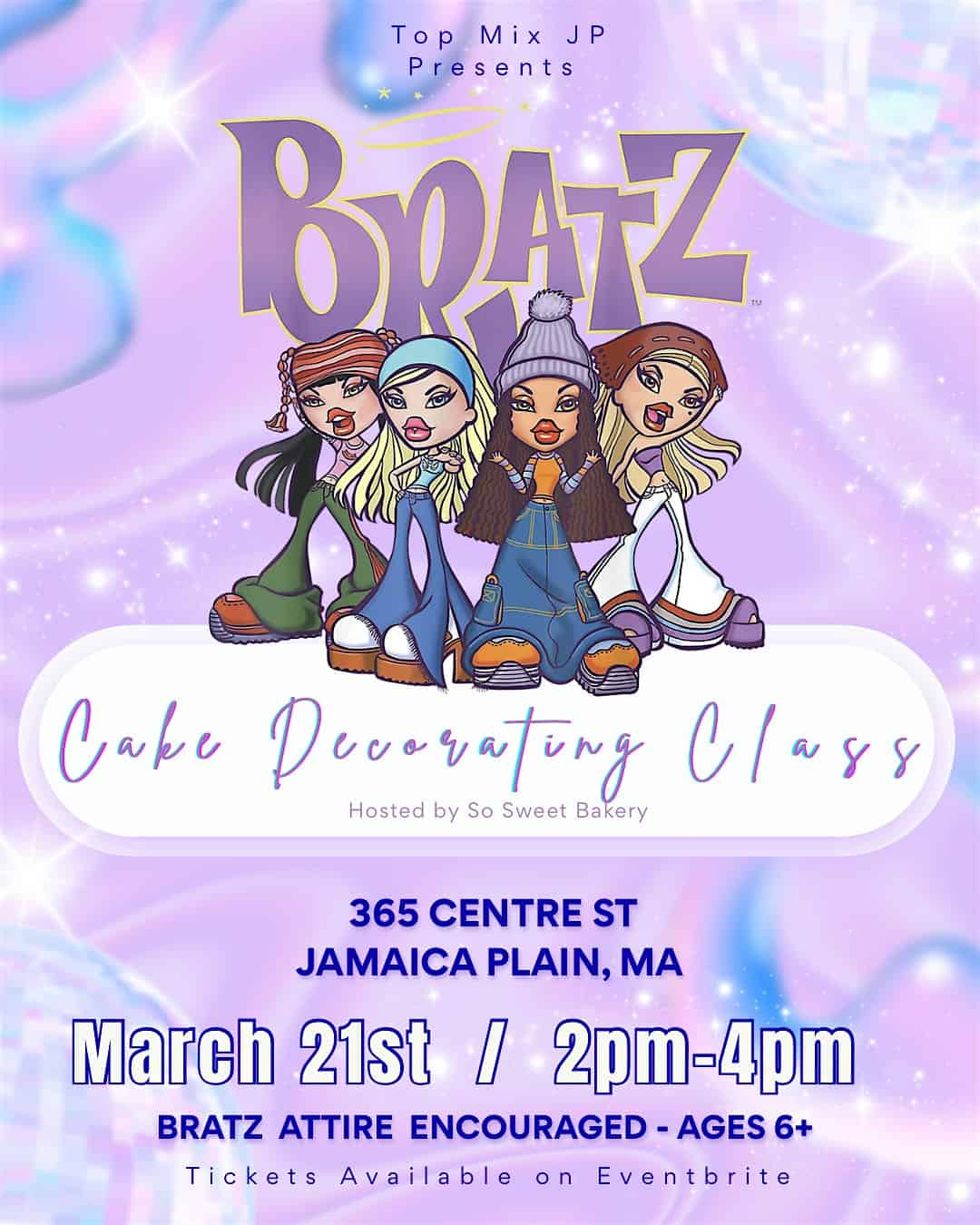 by admin14Feb Bratz Cake decorating Class at 365 Centre St – Boston, MA Bratz Cake decorating Class at 365 Centre St – Boston, MA 1 1 people viewed this event. Get ready to unleash your inner pastry chef and glam up some cakes Bratz-style! Tickets-RSVP Link Date And Time Saturday, March 21st, 2026 06:00 PM (PST) Venue 365 Centre St Location 365 Centre Street, Boston, MA 2130 Event Types Food & Drink Event Category BostonMassachusetts Share With Friends Facebook Twitter Linkedin Xing Pinterest Share This Post: