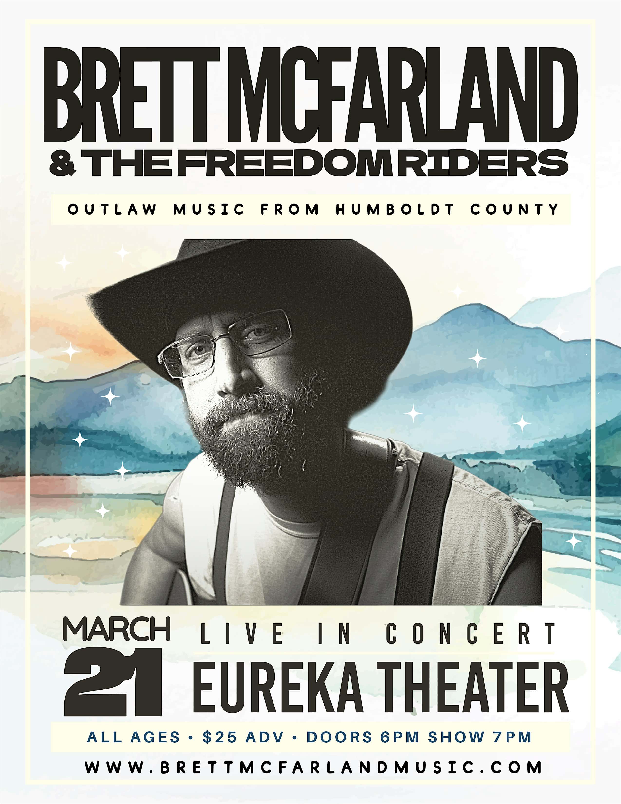 by admin23Feb Brett McFarland and the Freedom Riders at The Eureka Theater – Eureka, CA Brett McFarland and the Freedom Riders at The Eureka Theater – Eureka, CA 1 1 people viewed this event. The Eureka Theater presents Humboldt County’s outlaw country hero for a night of music steeped in grit, heart, and lived experience. Tickets-RSVP Link Date And Time Saturday, March 21st, 2026 06:00 PM (PST) Venue The Eureka Theater Location 612 F Street, Eureka, CA 95501 Event Types Concert or PerformanceMusic Event Category California Share With Friends Facebook Twitter Linkedin Xing Pinterest Share This Post: