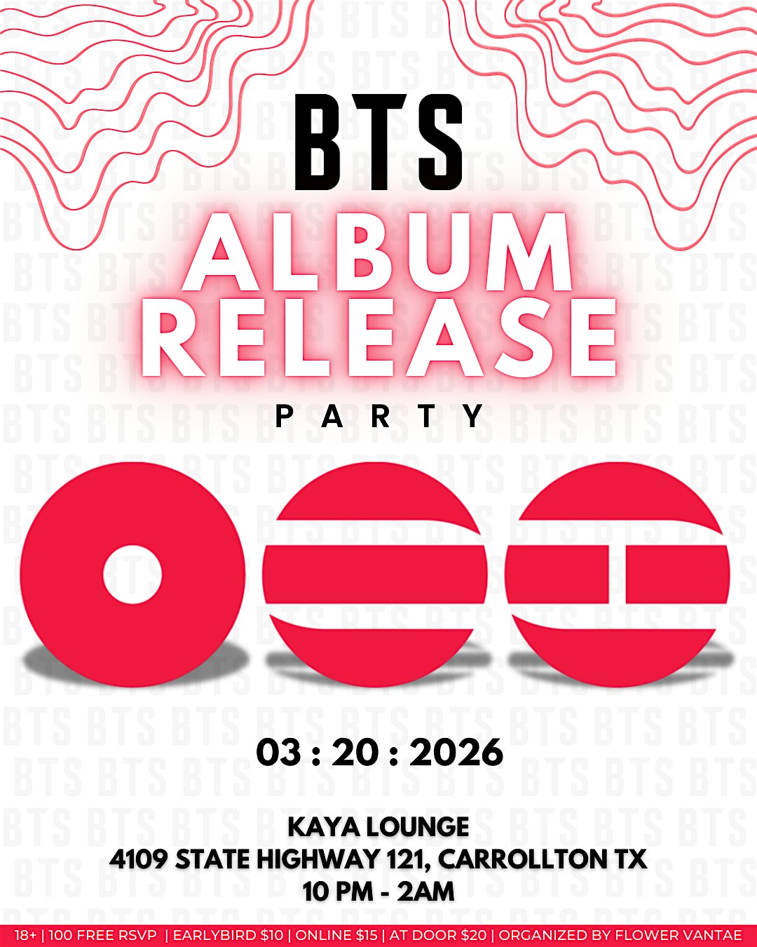 by admin13Feb BTS Album Release Party at Pochakaya, State Highway 121, Carrollton, TX, USA – Carrollton, TX BTS Album Release Party at Pochakaya, State Highway 121, Carrollton, TX, USA – Carrollton, TX 2 2 people viewed this event. Who is ready to party all night with ARMY??? Join us as we celebrate BTS New ALBUM!!! Tickets-RSVP Link Date And Time Saturday, March 21st, 2026 03:00 AM (PST) Venue Pochakaya, State Highway 121, Carrollton, TX, USA Location 4109 State Highway 121, Carrollton, TX 75010 Event Types MusicParty or Social Gathering Event Category DallasTexas Share With Friends Facebook Twitter Linkedin Xing Pinterest Share This Post: