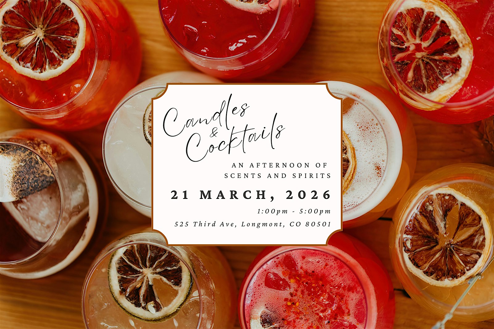 by admin27Feb Candles & Cocktails at Wax Crescent – Longmont, CO Candles & Cocktails at Wax Crescent – Longmont, CO 1 1 people viewed this event. Join us for an afternoon of scents & spirits. Each guest will enjoy a complimentary cocktail, and create their own custom candle. Tickets-RSVP Link Date And Time Saturday, March 21st, 2026 01:00 PM (PST) Venue Wax Crescent Location 525 3rd Avenue, Longmont, CO 80501 Event Types Food & DrinkParty or Social Gathering Event Category BoulderColorado Share With Friends Facebook Twitter Linkedin Xing Pinterest Share This Post: