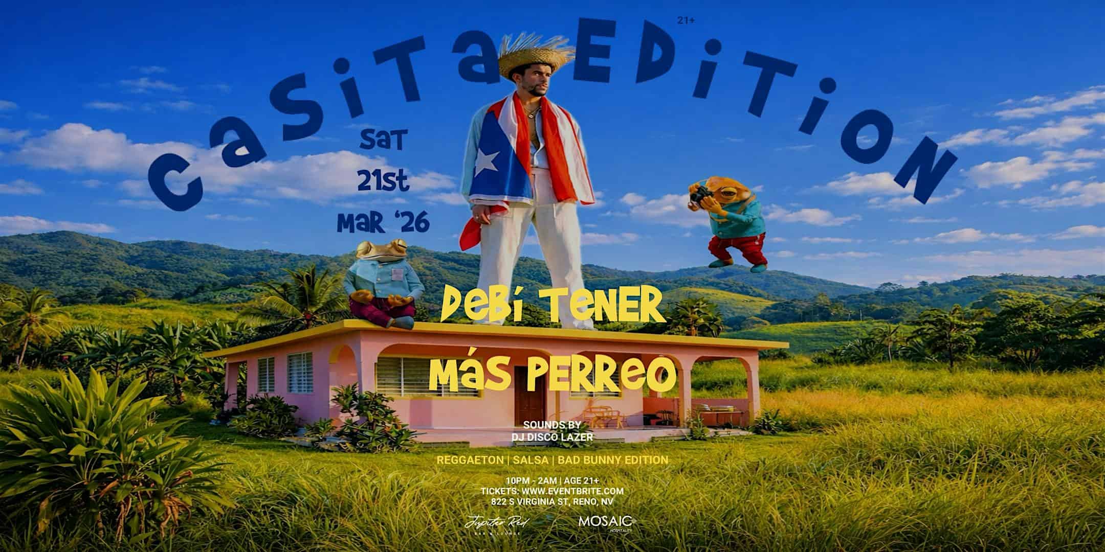 by admin23Feb Casita Edition: Debí Tener Más Perreo – Bad Bunny Night at Jupiter Red at 822 S Virginia St – Reno, NV Casita Edition: Debí Tener Más Perreo – Bad Bunny Night at Jupiter Red at 822 S Virginia St – Reno, NV 3 3 people viewed this event. Get ready to dance all night long to Bad Bunny’s hottest hits at Jupiter Red – it’s going to be a perreo-packed Casita Edition! Tickets-RSVP Link Date And Time Saturday, March 21st, 2026 10:00 PM (PST) Venue 822 S Virginia St Location 822 South Virginia Street, Reno, NV 89502 Event Types MusicParty or Social Gathering Event Category NevadaReno Share With Friends Facebook Twitter Linkedin Xing Pinterest Share This Post: