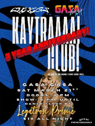 It is a club experience that celebrates Producer/Artist Kaytranada with nods to house, electronic, afro, r&b, beat breaking and dance culture curated by Clubs Legs Universe creator and DJ, Legatron Prime! The night is filled with Kaytranada tracks, self tracks, produced tracks and collaborative albums and the night includes sounds from artists that orbit the Kaytra atmosphere, deep cuts and fire edits. At Kaytraaaa! Club! It is a true ode to the dance floor, past, presence, and future, where the beat never stops and the dance floor is always hot! This Kaytraaaa! Club! Hosted at GASA GASA will be the celebration of 3 years on the dance floor! 3 years of house and electronic music, and sounds that will make you move! Celebrate 3 years of Kaytraaaa! Club!