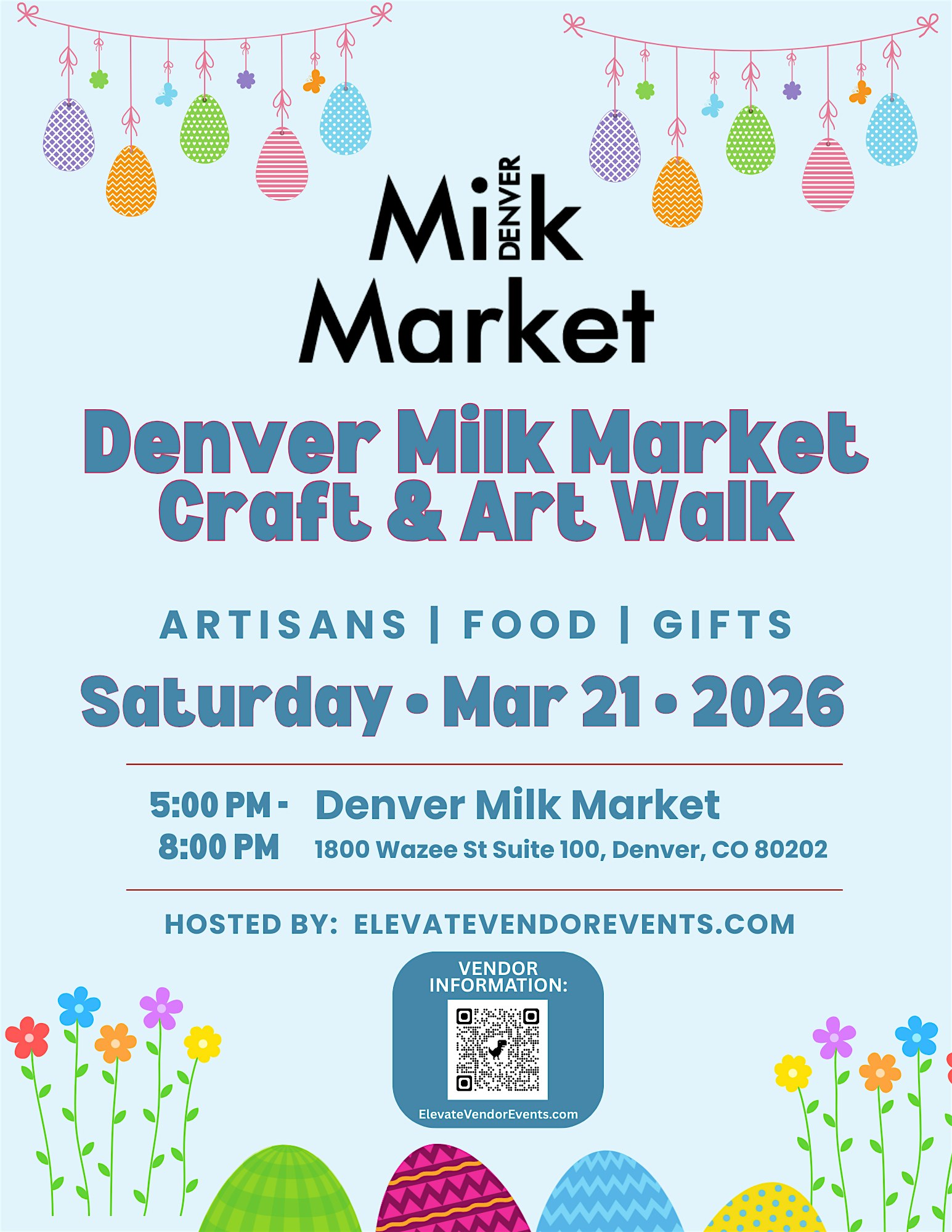 by admin27Feb Denver Milk Market Spring Craft & Art Walk at Denver Milk Market – Denver, CO Denver Milk Market Spring Craft & Art Walk at Denver Milk Market – Denver, CO 1 1 people viewed this event. Shop local artisans, handmade goods, art & unique gifts at Denver Milk Market. Free entry. Saturday, March 21, 5–8PM. Tickets-RSVP Link Date And Time Saturday, March 21st, 2026 05:00 PM (PST) Venue Denver Milk Market Location 1800 Wazee Street, Denver, CO 80202 Event Types Festival or FairFood & Drink Event Category ColoradoDenver Share With Friends Facebook Twitter Linkedin Xing Pinterest Share This Post: