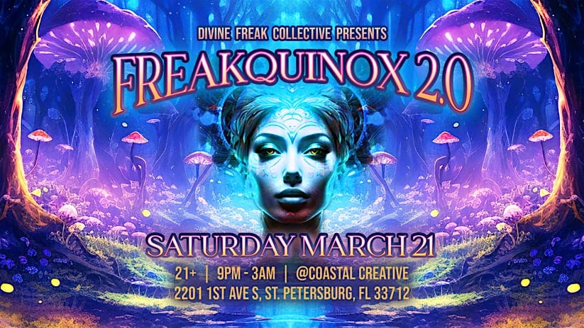 by admin23Feb Divine Freak Collective Presents: FREAKQUINOX 2.0 at Coastal Creative – St. Petersburg, FL Divine Freak Collective Presents: FREAKQUINOX 2.0 at Coastal Creative – St. Petersburg, FL 1 1 people viewed this event. DOWNTOWN ST.PETE FESTIVAL STYLE EDM PARTY (SPRING EQUINOX: ENCHANTED FOREST THEMED) Tickets-RSVP Link Date And Time Saturday, March 21st, 2026 09:00 PM (PST) Venue Coastal Creative Location 2201 1st Avenue South, St. Petersburg, FL 33712 Event Types MusicParty or Social Gathering Event Category Florida Share With Friends Facebook Twitter Linkedin Xing Pinterest Share This Post:
