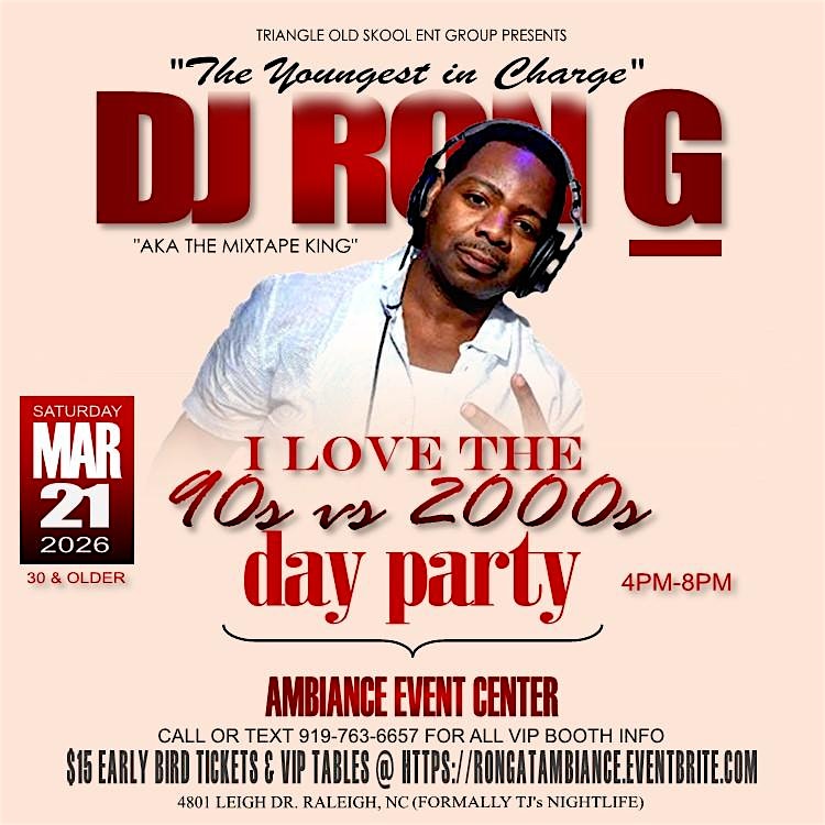 by admin13Feb DJ Ron G’s I love the 90s vs 2000s Day Party at Ambiance Event Center – Raleigh, NC DJ Ron G’s I love the 90s vs 2000s Day Party at Ambiance Event Center – Raleigh, NC 2 2 people viewed this event. $15 Early bird Tickets & VIP Tables Available TODAY @ https://rongatambiance.eventbrite.com or Cash App $triangleoldskool Tickets-RSVP Link Date And Time Saturday, March 21st, 2026 08:00 PM (PST) Venue Ambiance Event Center Location 4801 Leigh Drive, Raleigh, NC 27616 Event Types MusicParty or Social Gathering Event Category North CarolinaRaleigh Share With Friends Facebook Twitter Linkedin Xing Pinterest Share This Post: