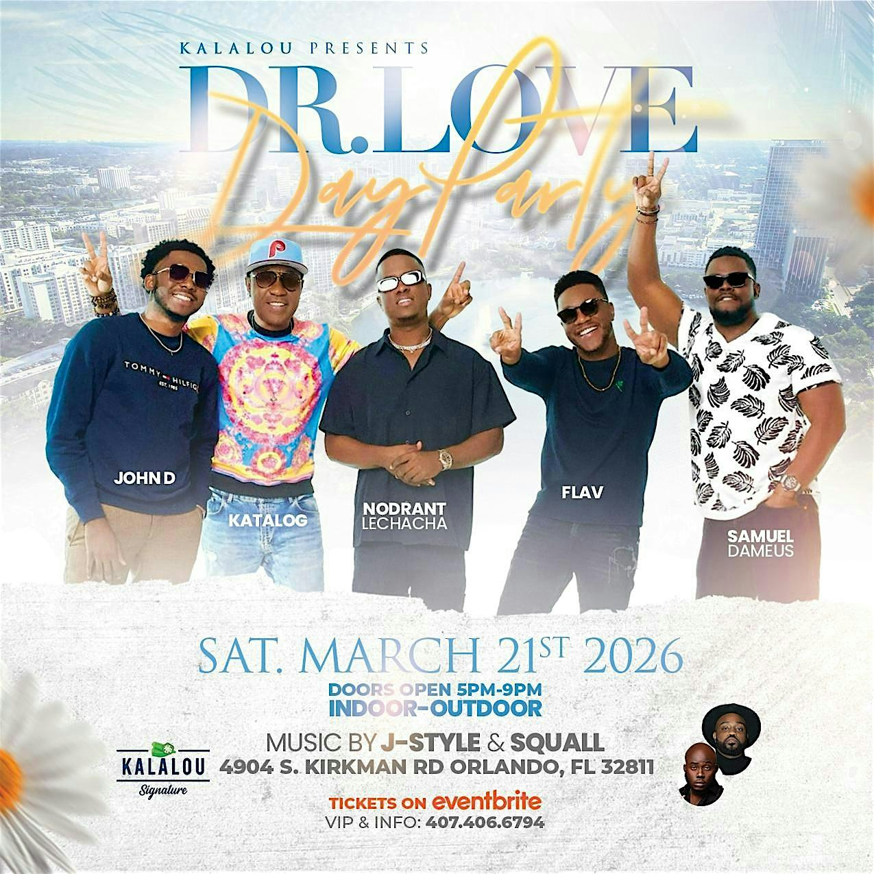 by admin27Feb Dr Love Day Party at Kalalou Signature – Orlando, FL Dr Love Day Party at Kalalou Signature – Orlando, FL 1 1 people viewed this event. Join us at Dr Love Day Party for fun vibes, sweet beats, and good times with your favorite people! Tickets-RSVP Link Date And Time Saturday, March 21st, 2026 05:00 PM (PST) Venue Kalalou Signature Location 4904 South Kirkman Road, Orlando, FL 32811 Event Types MusicParty or Social Gathering Event Category FloridaOrlando Share With Friends Facebook Twitter Linkedin Xing Pinterest Share This Post: