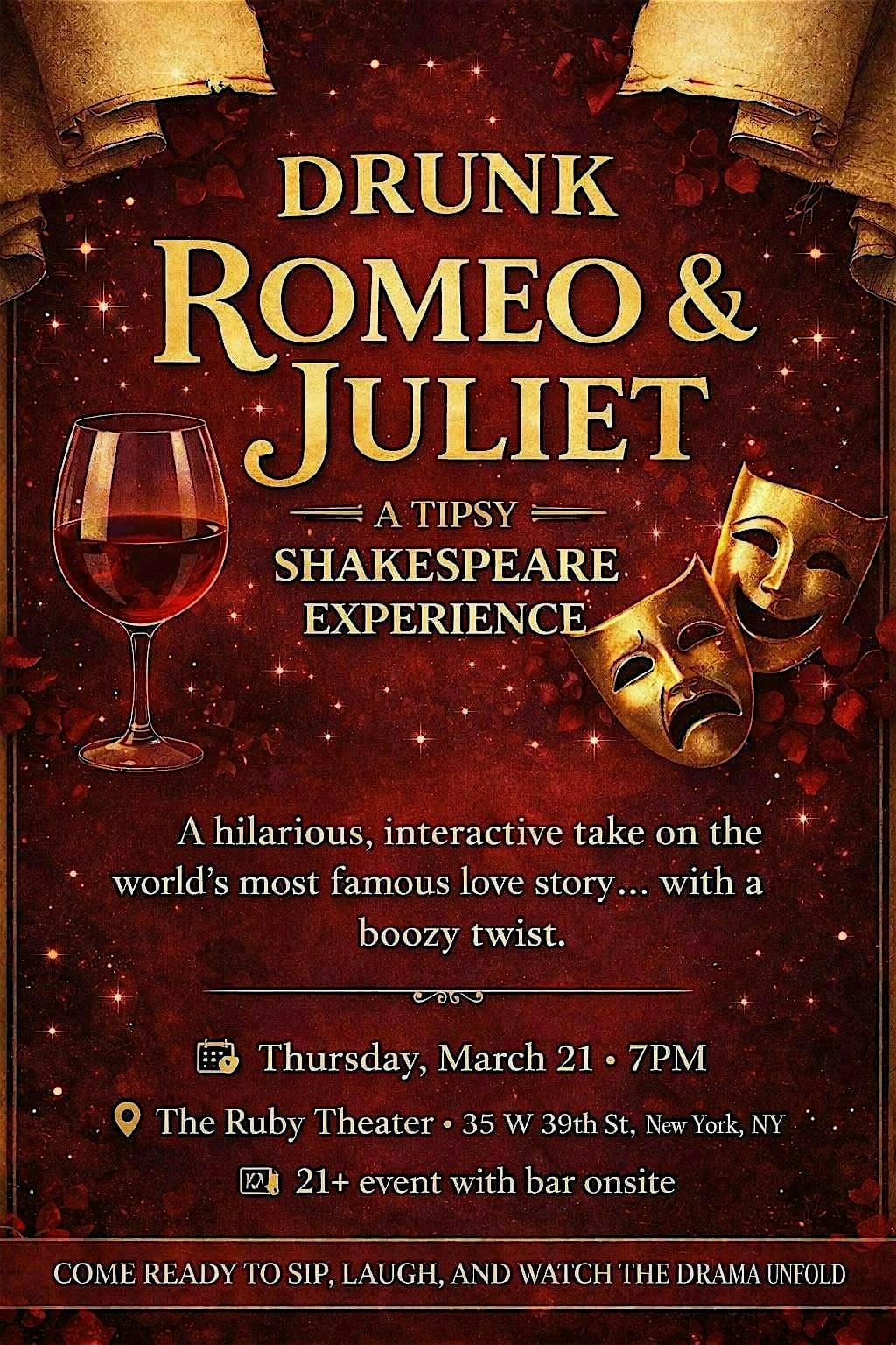 by admin05Mar Drunk Romeo & Juliet: A Tipsy Shakespeare Experience at 35 W 39th St – New York, NY Drunk Romeo & Juliet: A Tipsy Shakespeare Experience at 35 W 39th St – New York, NY 2 2 people viewed this event. Drunk Romeo & Juliet flips the script on traditional theater, fusing classic Shakespeare with comedy and improv. Tickets-RSVP Link Date And Time Saturday, March 21st, 2026 07:00 PM (PDT) Venue 35 W 39th St Location 35 West 39th Street, New York, NY 10018 Event Types Concert or PerformancePerforming & Visual Arts Event Category New YorkNew York City Share With Friends Facebook Twitter Linkedin Xing Pinterest Share This Post: