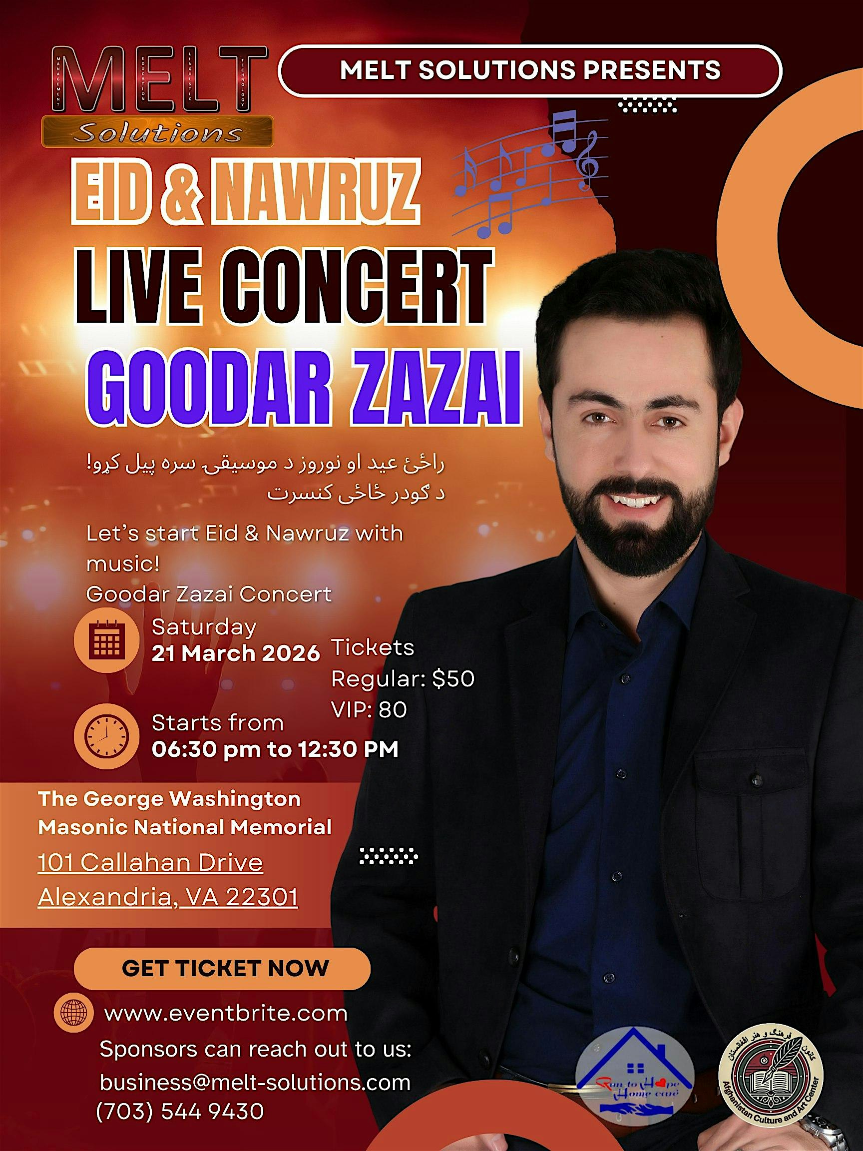 by admin23Feb Eid & Nawruz Concert with Goodar Zazai at 101 Callahan Dr – Alexandria, VA Eid & Nawruz Concert with Goodar Zazai at 101 Callahan Dr – Alexandria, VA 3 3 people viewed this event. Event Overview: Celebrate Eid with Afghanistan’s beloved artists, Ahmad Fanous. Tickets-RSVP Link Date And Time Saturday, March 21st, 2026 06:00 PM (PST) Venue 101 Callahan Dr Location 101 Callahan Drive, Alexandria, VA 22301 Event Types Concert or PerformanceMusic Event Category Virginia Share With Friends Facebook Twitter Linkedin Xing Pinterest Share This Post:
