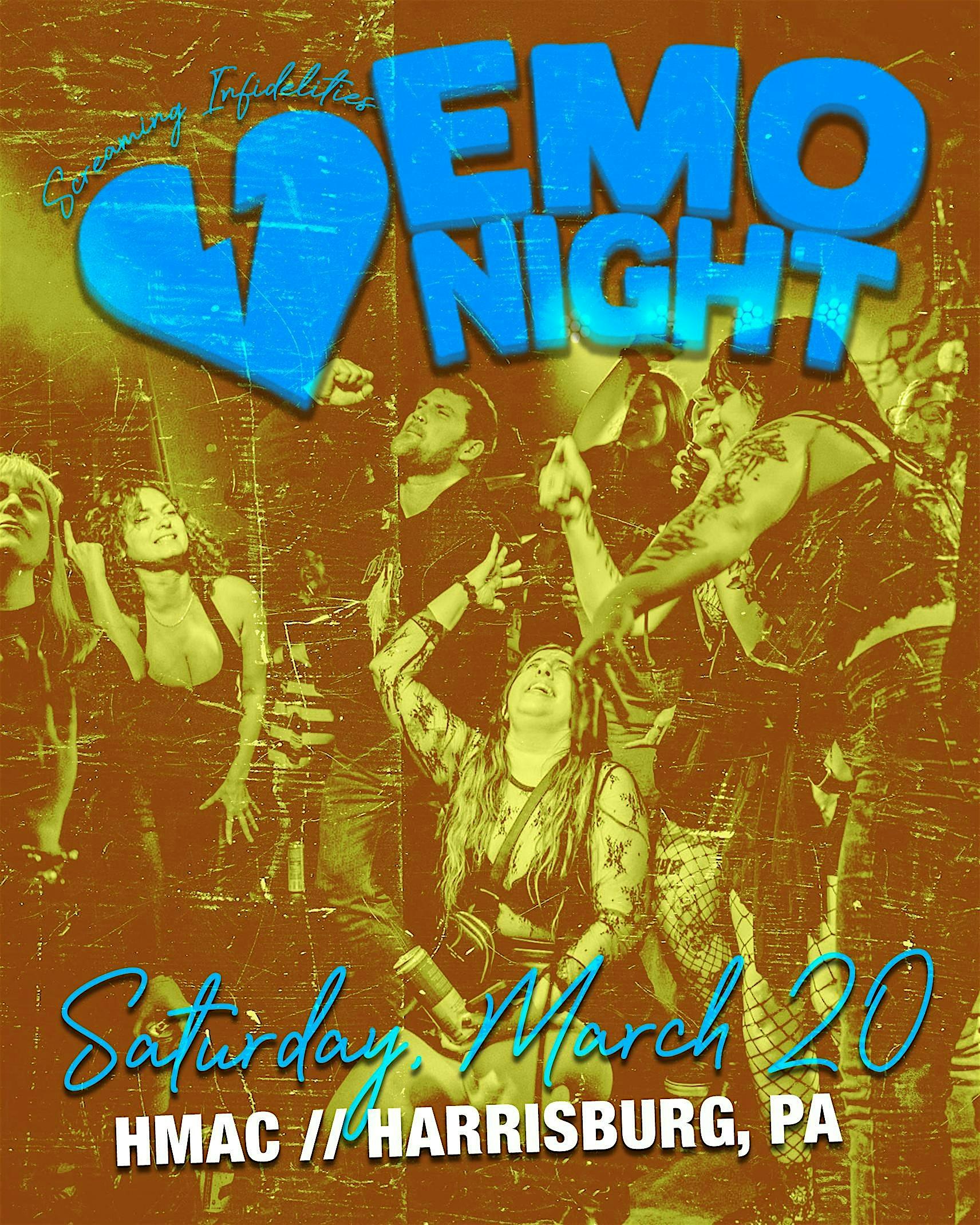 by admin13Feb Emo Night at HMAC at Harrisburg Midtown Arts Center – Harrisburg, PA Emo Night at HMAC at Harrisburg Midtown Arts Center – Harrisburg, PA 2 2 people viewed this event. The world’s best Emo Night returns to HMAC in Harrisburg on March 20 Tickets-RSVP Link Date And Time Saturday, March 21st, 2026 12:00 AM (PST) Venue Harrisburg Midtown Arts Center Location 1110 North 3rd Street, Harrisburg, PA 17102 Event Types MusicParty or Social Gathering Event Category Pennsylvania Share With Friends Facebook Twitter Linkedin Xing Pinterest Share This Post: