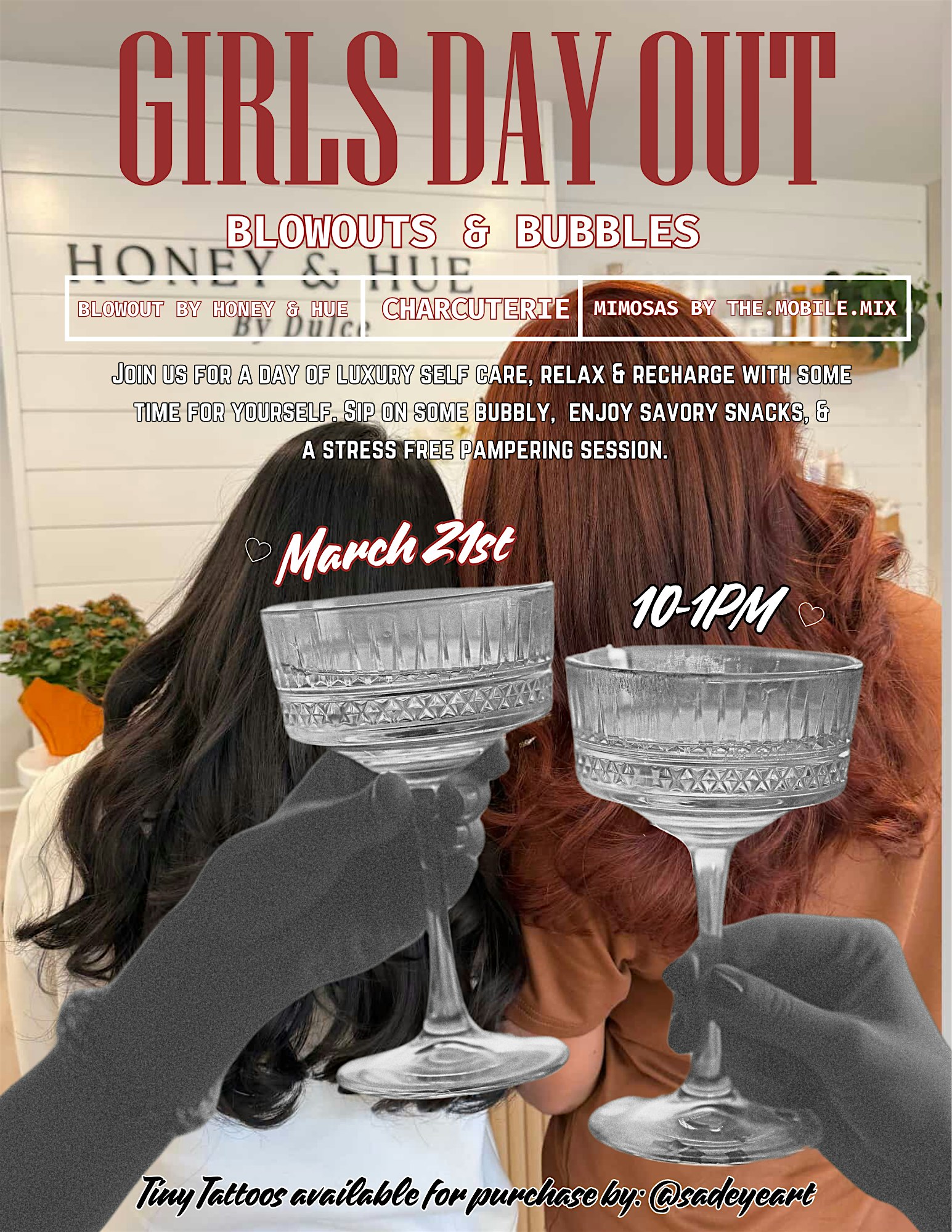 by admin27Feb Girls day out: blowouts & bubbles at Honey & Hue by Dulce – Winston-Salem, NC Girls day out: blowouts & bubbles at Honey & Hue by Dulce – Winston-Salem, NC 4 4 people viewed this event. Girls day out: Blowouts & Bubbles Tickets-RSVP Link Date And Time Saturday, March 21st, 2026 @ 10:00 AM Location 3630 Hewes Lane Southwest, Winston-Salem, NC 27103 Event Types Fashion & BeautyParty or Social Gathering Event Category North CarolinaWinston Salem Share With Friends Facebook Twitter Linkedin Xing Pinterest Share This Post: