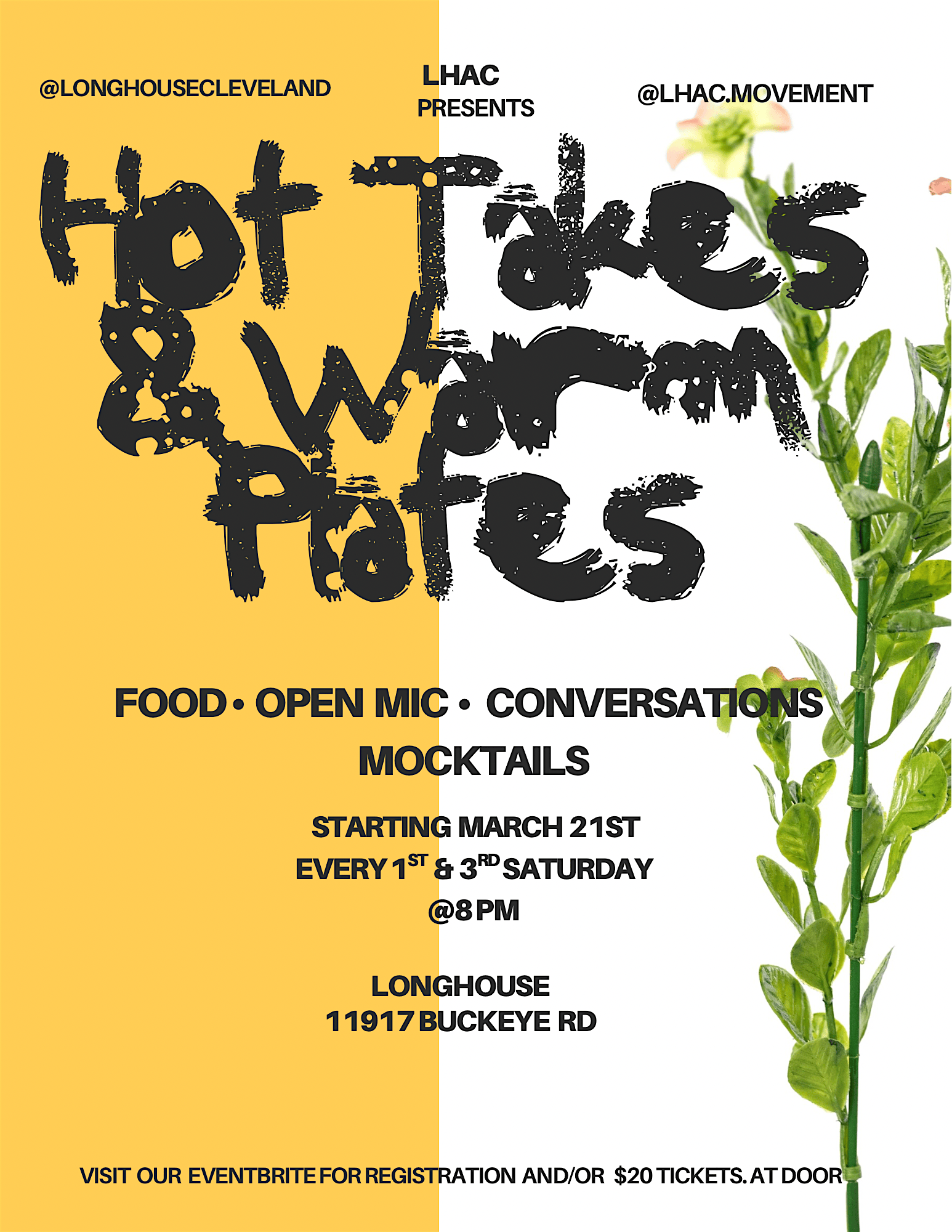 Hot Takes & Warm Plates at 11919 Buckeye Rd – Cleveland, OH Hot Takes & Warm Plates at 11919 Buckeye Rd – Cleveland, OH 3 3 people viewed this event. Hot Takes and Warm Plates : Food open mic, deep conversations, and mocktails and served with d’oeuvres at Longhouse Tickets-RSVP Link Register for event Date And Time Saturday, March 21st, 2026 @ 08:00 PM Location 11919 Buckeye Road, Cleveland, OH 44120 Event Types Food & DrinkParty or Social Gathering Event Category ClevelandOhio Share With Friends Facebook Twitter Linkedin Xing Pinterest