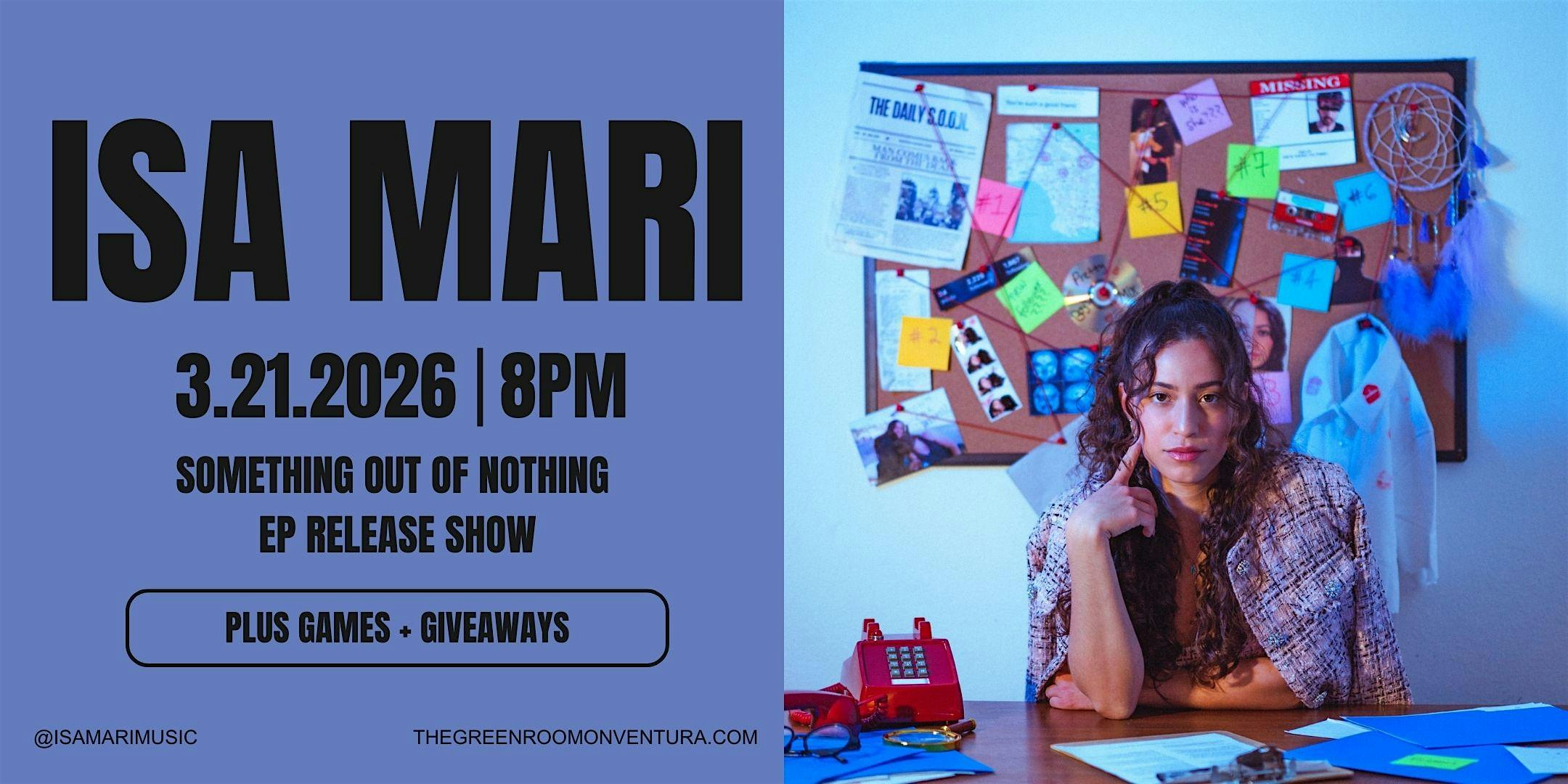by admin27Feb Isa Mari – Something out of Nothing EP Release Show at The Green Room on Ventura 21+ Events Space – Los Angeles, CA Isa Mari – Something out of Nothing EP Release Show at The Green Room on Ventura 21+ Events Space – Los Angeles, CA 1 1 people viewed this event. Catch Isa Mari dropping fresh vibes live as she brings Something out of Nothing to life in an epic EP release party. Tickets-RSVP Link Date And Time Saturday, March 21st, 2026 08:00 PM (PST) Venue The Green Room on Ventura 21+ Events Space Location 14082 Ventura Boulevard, Los Angeles, CA 91423 Event Types Concert or PerformanceMusic Event Category CaliforniaLos Angeles Share With Friends Facebook Twitter Linkedin Xing Pinterest Share This Post: