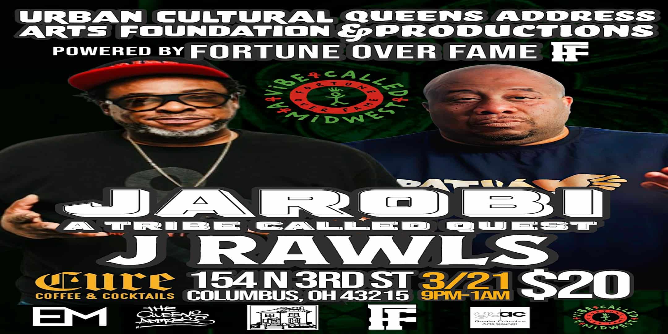 by admin23Feb Jarobi White (ATCQ) & J. Rawls – Live DJ Sets | Cure, Columbus, OH at Cure Coffee and Cocktails – Columbus, OH Jarobi White (ATCQ) & J. Rawls – Live DJ Sets | Cure, Columbus, OH at Cure Coffee and Cocktails – Columbus, OH 1 1 people viewed this event. Together, J. Rawls and Jarobi curate a night of melodic sound waves, boom-bap rhythms, jazz-infused grooves, and conscious classics. Tickets-RSVP Link Date And Time Saturday, March 21st, 2026 09:00 PM (PST) Venue Cure Coffee and Cocktails Location 154 North 3rd Street, Columbus, OH 43215 Event Types Concert or PerformanceMusic Event Category Ohio Share With Friends Facebook Twitter Linkedin Xing Pinterest Share This Post:
