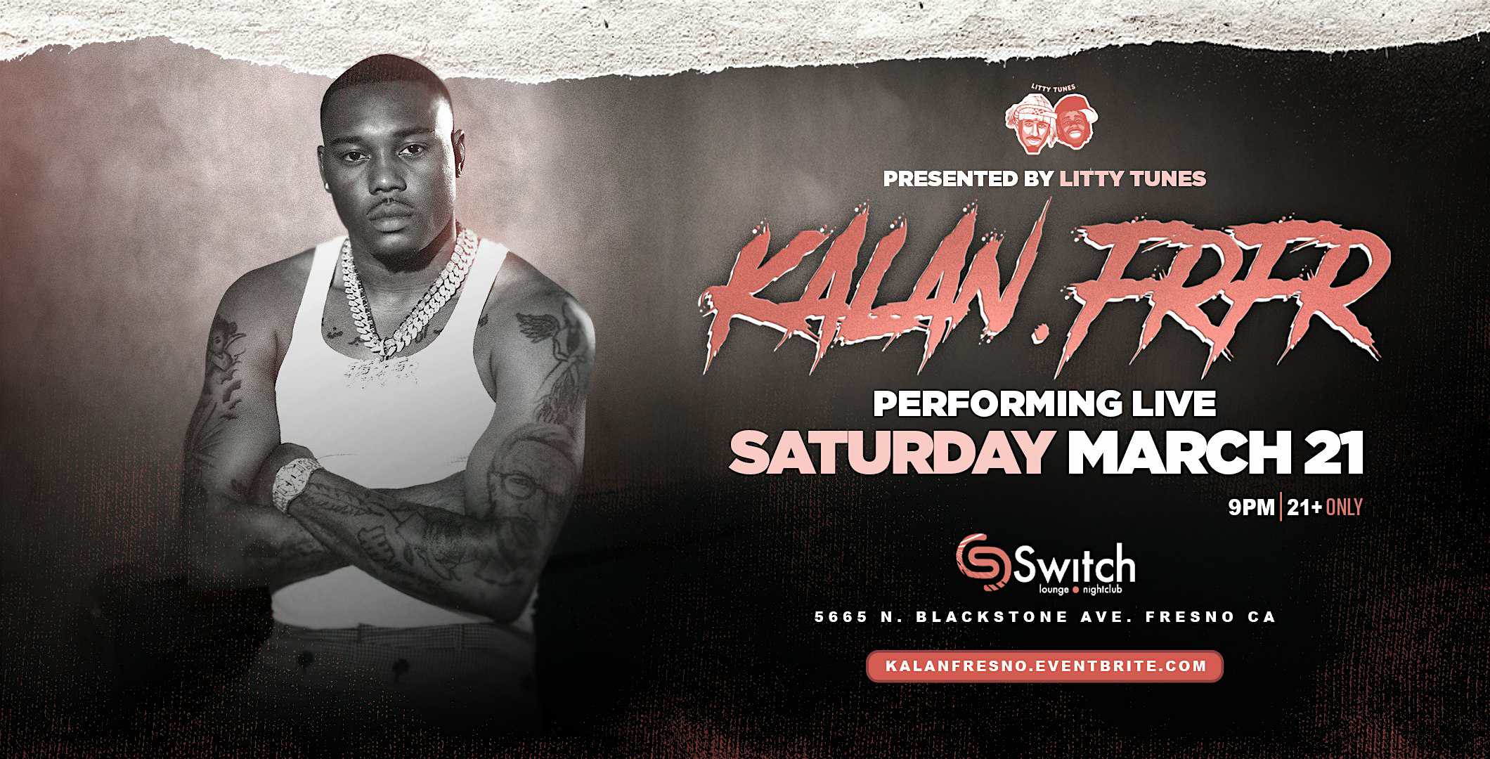 by admin23Feb KALAN FRFR IN FRESNO – 21+ at Switch Lounge & Nightclub – Fresno, CA KALAN FRFR IN FRESNO – 21+ at Switch Lounge & Nightclub – Fresno, CA 2 2 people viewed this event. Kalan.FrFr performing live in Fresno at SWITCH NIGHTCLUB 21+ Tickets-RSVP Link Date And Time Saturday, March 21st, 2026 09:00 PM (PST) Venue Switch Lounge & Nightclub Location 5665 North Blackstone Avenue, Fresno, CA 93710 Event Types Concert or PerformanceMusic Event Category California Share With Friends Facebook Twitter Linkedin Xing Pinterest Share This Post: