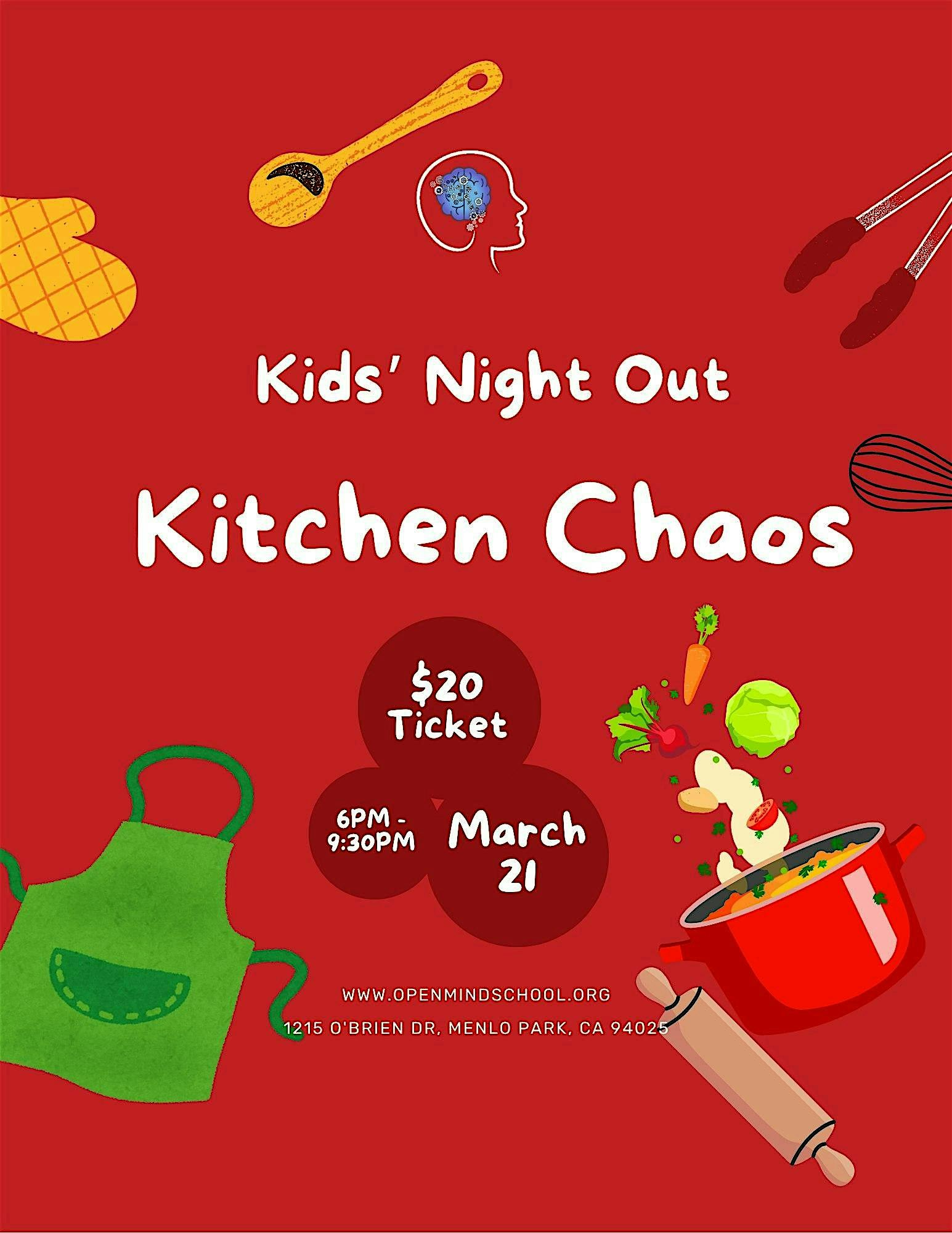 by admin27Feb Kids’ Night Out Kitchen Chaos at 1215 O’Brien Dr – Menlo Park, CA Kids’ Night Out Kitchen Chaos at 1215 O’Brien Dr – Menlo Park, CA 1 1 people viewed this event. Join us for Kid’s Night Out: Kitchen Chaos, where kids take over the kitchen for a night of messy, creative, and delicious fun! Tickets-RSVP Link Date And Time Saturday, March 21st, 2026 @ 06:00 PM Location 1215 O'Brien Drive, Menlo Park, CA 94025 Event Types Party or Social Gathering Event Category CaliforniaSan Jose Share With Friends Facebook Twitter Linkedin Xing Pinterest Share This Post:
