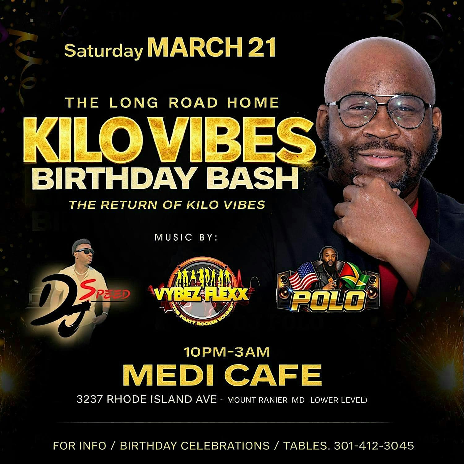 by admin23Feb KILO VIBES ANNUAL BIRTHDAY BASH at 3237 Rhode Island Ave – Mount Rainier, MD KILO VIBES ANNUAL BIRTHDAY BASH at 3237 Rhode Island Ave – Mount Rainier, MD 2 2 people viewed this event. SAT. MARCH 21ST “KILO VIBES ANNUAL BIRTHDAY BASH “ @MEDICAFE.MD 3237 RHODE ISLAND AVE. MOUNT RANIER, MD FOR INFO @DJKILOVIBES 301-412-3045 Tickets-RSVP Link Date And Time Saturday, March 21st, 2026 10:00 PM (PST) Venue 3237 Rhode Island Ave Location 3237 Rhode Island Avenue, Mount Rainier, MD 20712 Event Types MusicParty or Social Gathering Event Category Maryland Share With Friends Facebook Twitter Linkedin Xing Pinterest Share This Post: