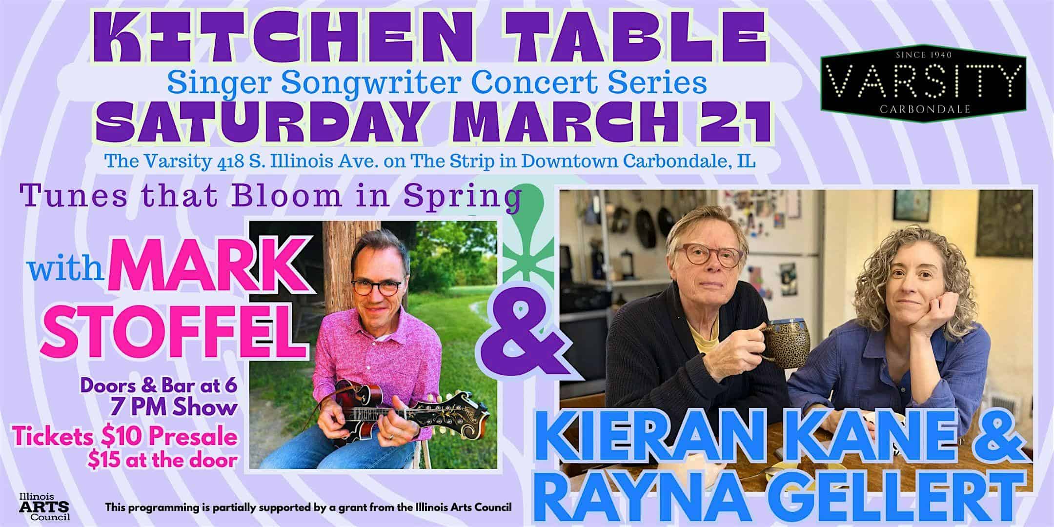 by admin23Feb Kitchen Table Songwriter Series at The Varsity Center – Carbondale, IL Kitchen Table Songwriter Series at The Varsity Center – Carbondale, IL 2 2 people viewed this event. Celebrate the Spring Equinox with Bluegrass, Roots and Americana Tickets-RSVP Link Date And Time Saturday, March 21st, 2026 07:00 PM (PST) Venue The Varsity Center Location 418 South Illinois Avenue, Carbondale, IL 62901 Event Types Concert or PerformanceMusic Event Category Illinois Share With Friends Facebook Twitter Linkedin Xing Pinterest Share This Post: