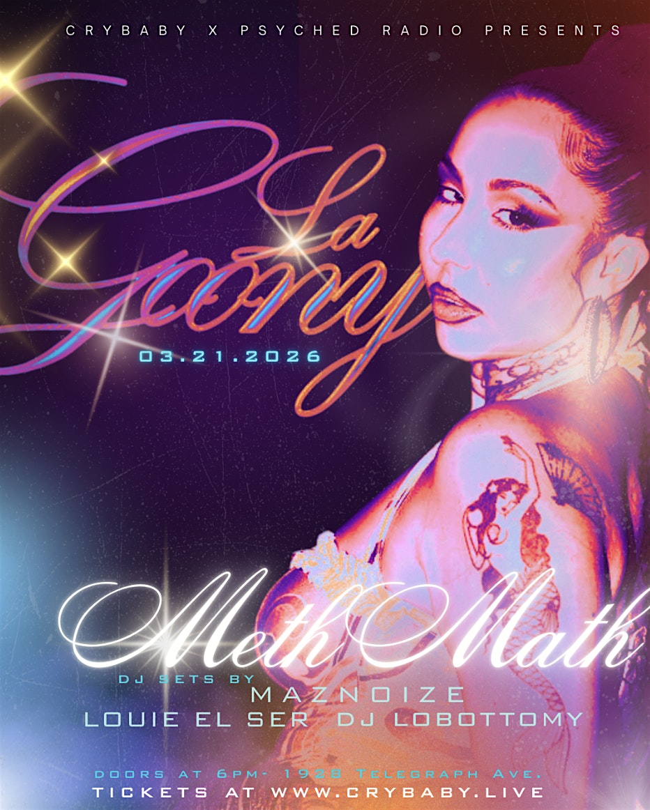 by admin24Feb LA GOONY x Meth Math w/ Maznoise + Louie el Ser + DJ Lobottomy at Crybaby – Oakland, CA LA GOONY x Meth Math w/ Maznoise + Louie el Ser + DJ Lobottomy at Crybaby – Oakland, CA 2 2 people viewed this event. Crybaby & Psyched! Radio are teaming up to bring the heat with LA GOONY and company! Tickets-RSVP Link Date And Time Saturday, March 21st, 2026 06:00 PM (PST) Venue Crybaby Location 1928 Telegraph Avenue, Oakland, CA 94612 Event Types Concert or PerformanceMusic Event Category CaliforniaOakland Share With Friends Facebook Twitter Linkedin Xing Pinterest Share This Post: