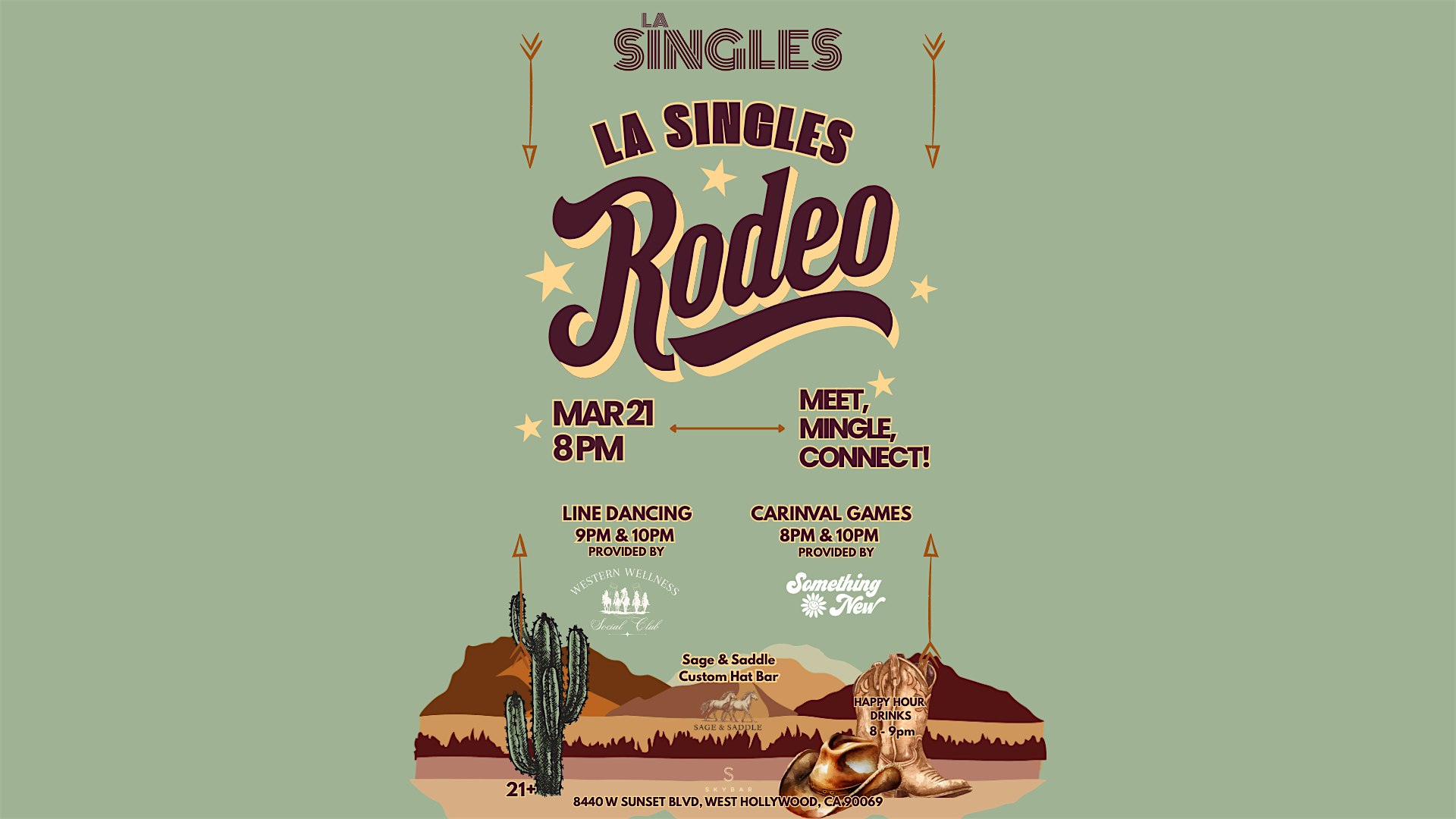 by admin24Feb LA SINGLES : RODEO at Skybar Los Angeles – West Hollywood, CA LA SINGLES : RODEO at Skybar Los Angeles – West Hollywood, CA 2 2 people viewed this event. Meet Singles IRL Join LA Singles for a high-energy Country Themed Night designed for real-life connection — no apps, just vibes. Tickets-RSVP Link Date And Time Saturday, March 21st, 2026 08:00 PM (PST) Venue Skybar Los Angeles Location 8440 West Sunset Boulevard, West Hollywood, CA 90069 Event Types Community & CultureParty or Social Gathering Event Category California Share With Friends Facebook Twitter Linkedin Xing Pinterest Share This Post: