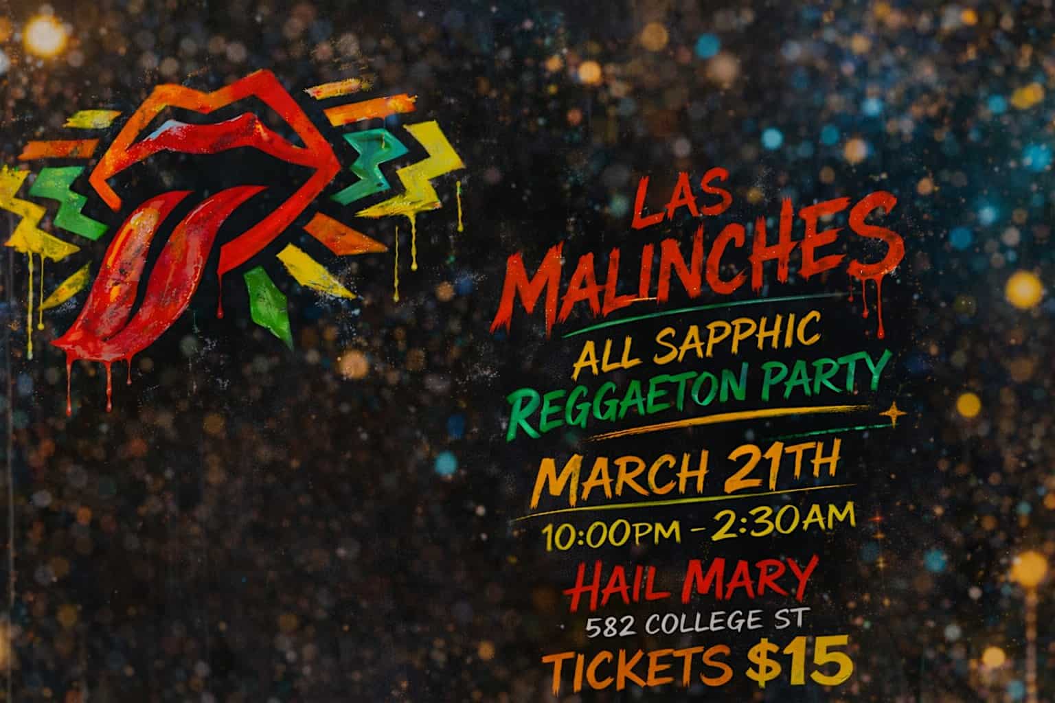 by admin23Feb Las Malinches: All Sapphic Reggaeton Party at hail mary – Toronto, Canada Las Malinches: All Sapphic Reggaeton Party at hail mary – Toronto, Canada 1 1 people viewed this event. Perreo baby, Tratra baby. Sapphic Reggaeton Party for al the nenas. Tickets-RSVP Link Date And Time Saturday, March 21st, 2026 10:00 PM (PST) Venue hail mary Location 582 College Street, Toronto, Canada M6G 1B3 Event Types MusicParty or Social Gathering Event Category CanadaToronto Share With Friends Facebook Twitter Linkedin Xing Pinterest Share This Post: