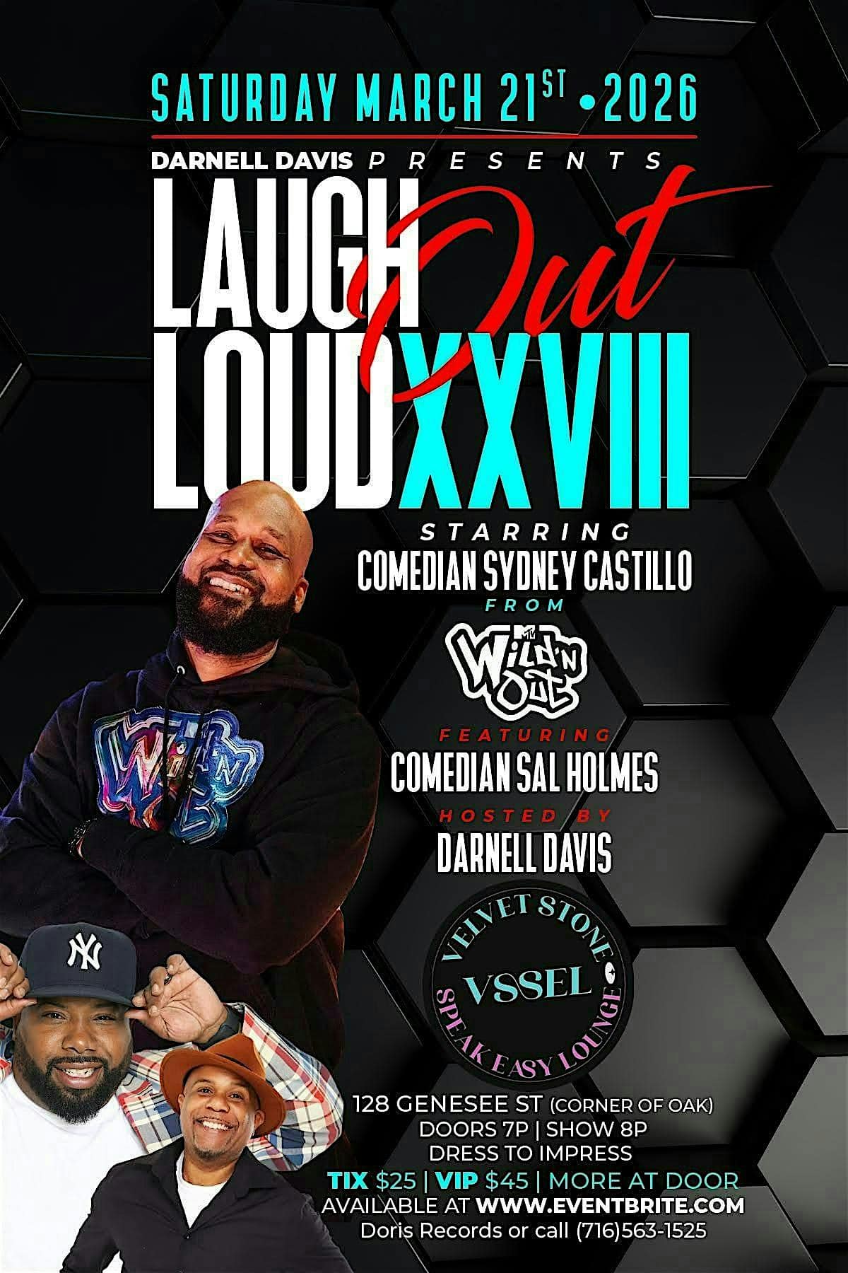 by admin05Mar Laugh Out Loud Volume XXVIII starring Comedian Sydney Castillo at Velvet Stone – Buffalo, NY Laugh Out Loud Volume XXVIII starring Comedian Sydney Castillo at Velvet Stone – Buffalo, NY 2 2 people viewed this event. Get ready to crack up with Sydney Castillo live at Laugh Out Loud Volume XXVIII—comedy vibes only! Tickets-RSVP Link Date And Time Saturday, March 21st, 2026 08:00 PM (PDT) Venue Velvet Stone Location 128 Genesee Street, Buffalo, NY 14203 Event Types Concert or PerformancePerforming & Visual Arts Event Category BuffaloNew York Share With Friends Facebook Twitter Linkedin Xing Pinterest Share This Post: