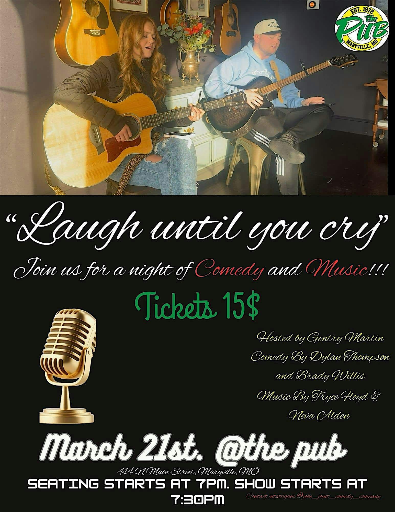 by admin23Feb Laugh Until You Cry Comedy and Music Event at The Pub – Maryville, MO Laugh Until You Cry Comedy and Music Event at The Pub – Maryville, MO 2 2 people viewed this event. Get ready to laugh until your cheeks hurt at the comedy show of the year! Tickets-RSVP Link Date And Time Saturday, March 21st, 2026 07:00 PM (PST) Venue The Pub Location 414 North Main Street, Maryville, MO 64468 Event Types Concert or PerformanceMusic Event Category Missouri Share With Friends Facebook Twitter Linkedin Xing Pinterest Share This Post: