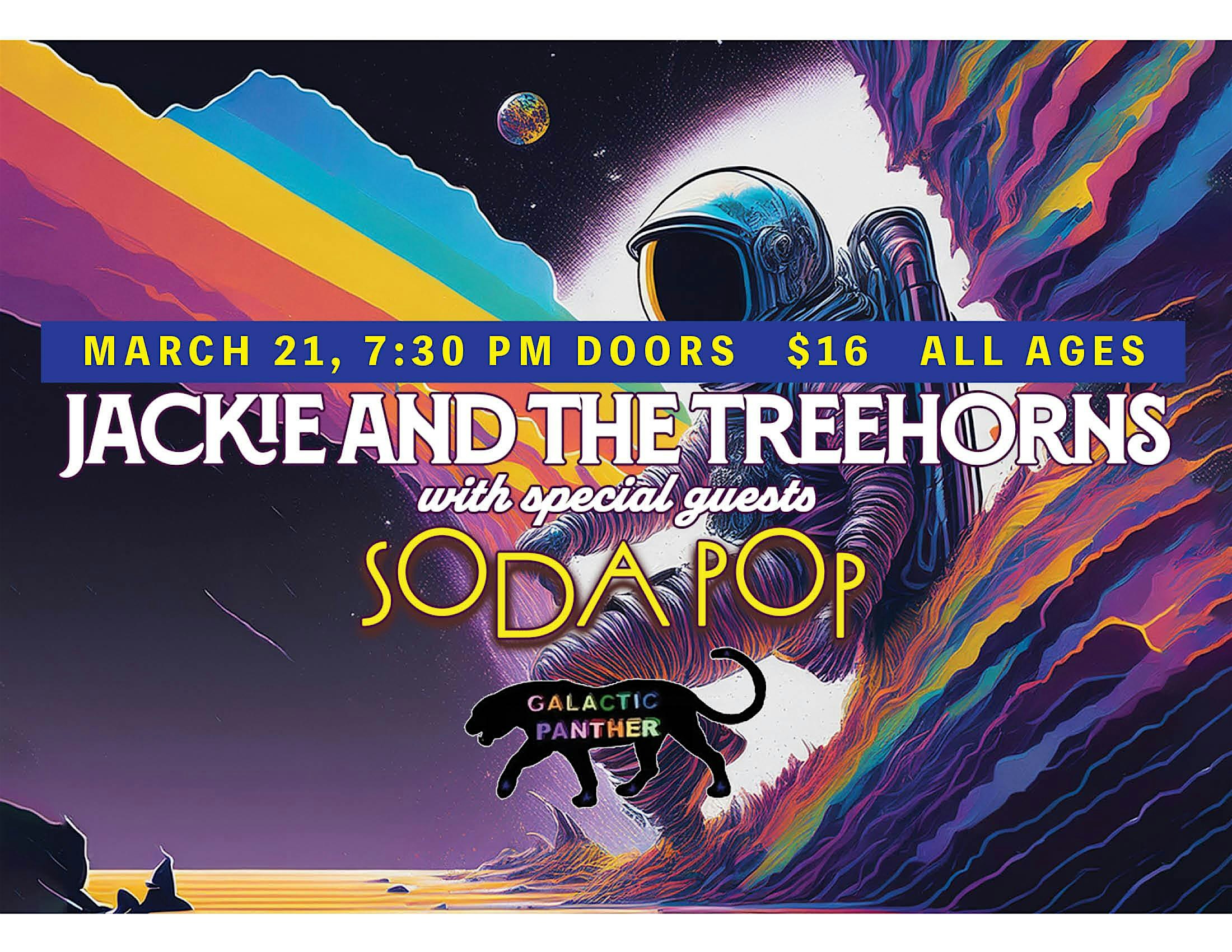 by admin23Feb LIVE MUSIC: Jackie and The Treehorns with special guests Soda Pop at Galactic Panther Art Gallery – Alexandria, VA LIVE MUSIC: Jackie and The Treehorns with special guests Soda Pop at Galactic Panther Art Gallery – Alexandria, VA 2 2 people viewed this event. Get ready to rock out with LIVE MUSIC by Jackie and The Treehorns, joined by special guests Soda Pop for an unforgettable night! Tickets-RSVP Link Date And Time Saturday, March 21st, 2026 07:00 PM (PST) Venue Galactic Panther Art Gallery Location 1303 King st, Alexandria, VA 22314 Event Types Concert or PerformanceMusic Event Category Virginia Share With Friends Facebook Twitter Linkedin Xing Pinterest Share This Post: