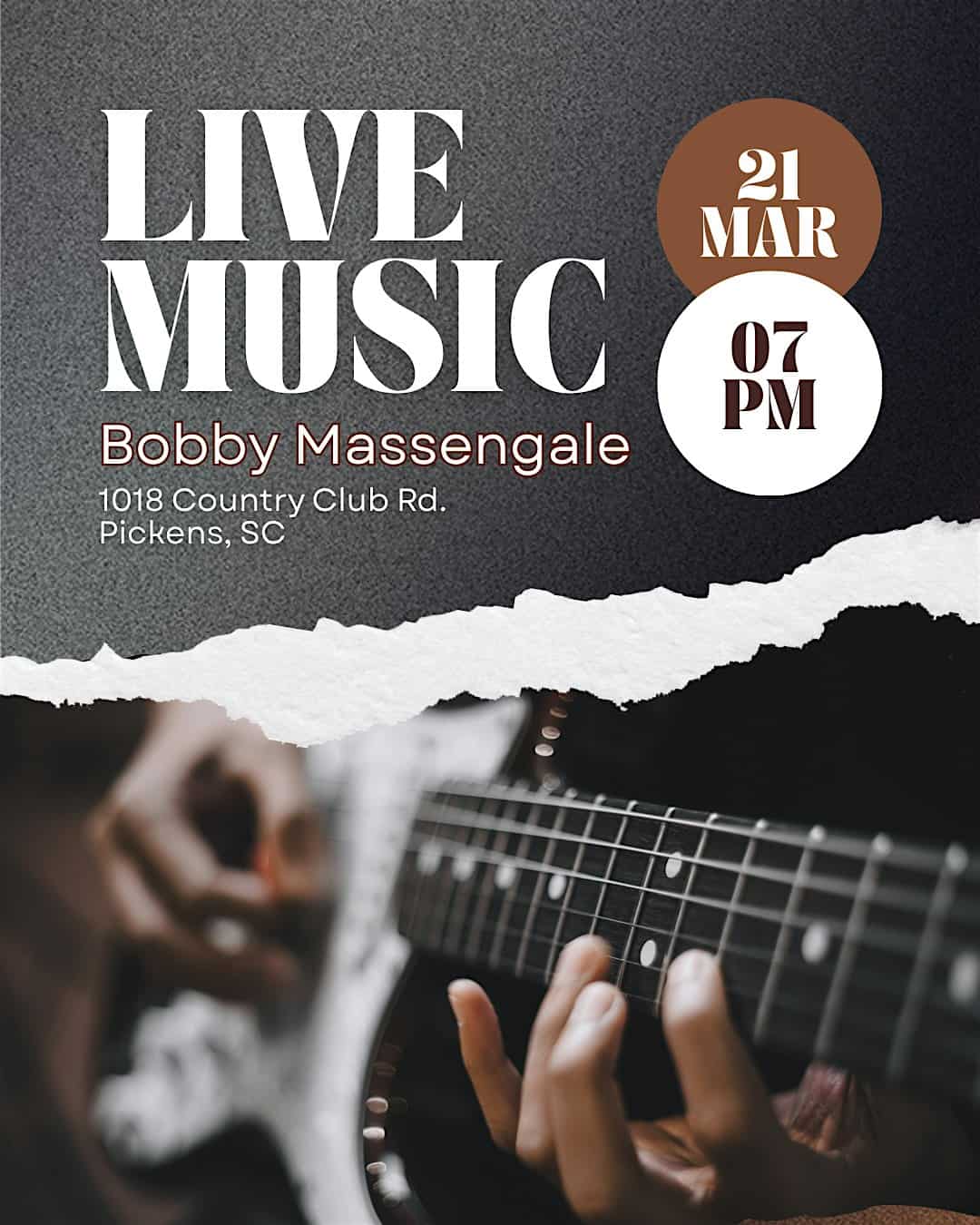 by admin23Feb Live Music with Bobby Massingale at Tavern 53 at Tavern 53 – Pickens, SC Live Music with Bobby Massingale at Tavern 53 at Tavern 53 – Pickens, SC 1 1 people viewed this event. Catch Bobby Massingale live at Tavern 53 for an unforgettable night of great tunes and good vibes! Tickets-RSVP Link Date And Time Saturday, March 21st, 2026 07:00 PM (PST) Venue Tavern 53 Location 1018 State Road S-39-204, Pickens, SC 29671 Event Types Concert or PerformanceMusic Event Category South Carolina Share With Friends Facebook Twitter Linkedin Xing Pinterest Share This Post: