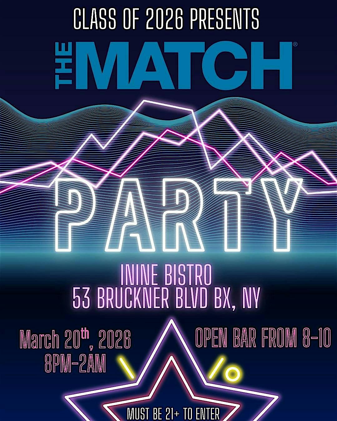 by admin13Feb Match Day Party By Night at iNINE Bistro – The Bronx, NY Match Day Party By Night at iNINE Bistro – The Bronx, NY 1 1 people viewed this event. Official Match Party- Celebrate the LUCKIEST day of the year with CUNY School of Medicine Tickets-RSVP Link Date And Time Saturday, March 21st, 2026 12:00 AM (PST) Venue iNINE Bistro Location 53 Bruckner Boulevard, The Bronx, NY 10454 Event Types Community & CultureParty or Social Gathering Event Category New YorkNew York City Share With Friends Facebook Twitter Linkedin Xing Pinterest Share This Post: