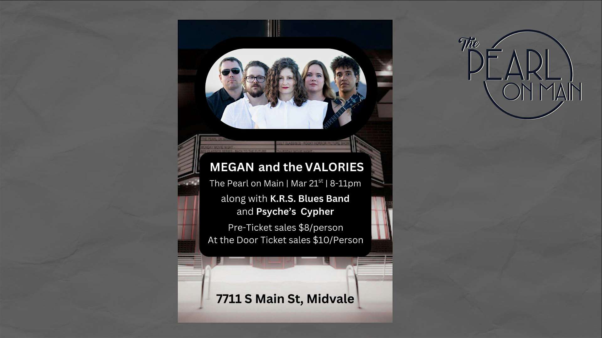 by admin23Feb Megan and the Valories at The Pearl on Main – Midvale, UT Megan and the Valories at The Pearl on Main – Midvale, UT 1 1 people viewed this event. Megan and the Valories with K.R.S. Blues Band and Psyche’s Cypher Doors – 7:30 PM – Music -8 PM Tickets-RSVP Link Date And Time Saturday, March 21st, 2026 08:00 PM (PST) Venue The Pearl on Main Location 7711 South Main Street, Midvale, UT 84047 Event Types Concert or PerformanceMusic Event Category Salt Lake CityUtah Share With Friends Facebook Twitter Linkedin Xing Pinterest Share This Post:
