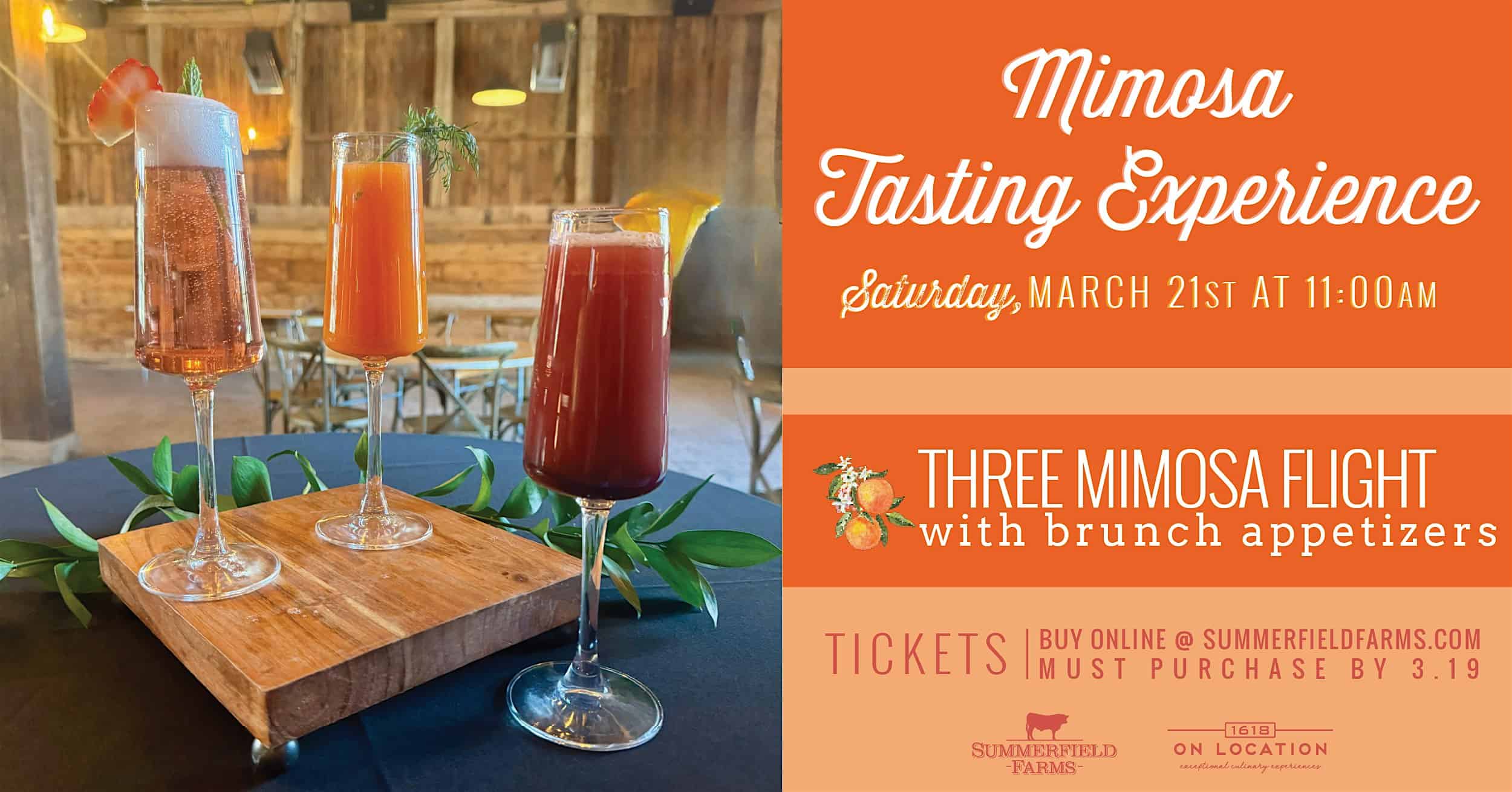 by admin23Feb Mimosa Tasting Experience at Summerfield Farms – Summerfield, NC Mimosa Tasting Experience at Summerfield Farms – Summerfield, NC 2 2 people viewed this event. Sip & savor a flight of mimosas paired with brunch bites by 1618 On Location! The perfect bubbly brunch experience awaits! ✨ Tickets-RSVP Link Date And Time Saturday, March 21st, 2026 11:00 AM (PST) Venue Summerfield Farms Location 3203 Pleasant Ridge Road, Summerfield, NC 27358 Event Types Food & DrinkParty or Social Gathering Event Category North Carolina Share With Friends Facebook Twitter Linkedin Xing Pinterest Share This Post:
