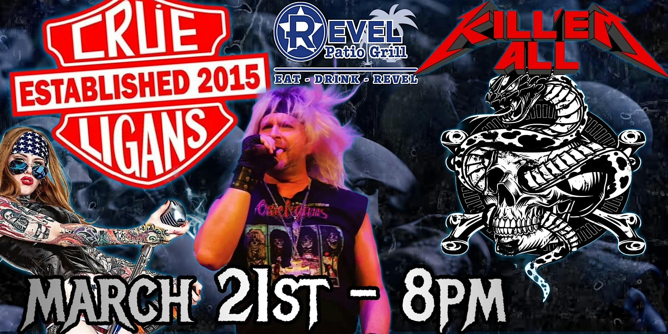 by admin27Feb Motley Crue Trib. – Crueligans & Metallica Tribute – Kill Em All at The Revel – Frisco, TX Motley Crue Trib. – Crueligans & Metallica Tribute – Kill Em All at The Revel – Frisco, TX 1 1 people viewed this event. The ultimate rock experience Tickets-RSVP Link Date And Time Saturday, March 21st, 2026 08:00 PM (PST) Venue The Revel Location 9305 Preston Road, Frisco, TX 75033 Event Types Concert or PerformanceMusic Event Category DallasTexas Share With Friends Facebook Twitter Linkedin Xing Pinterest Share This Post: