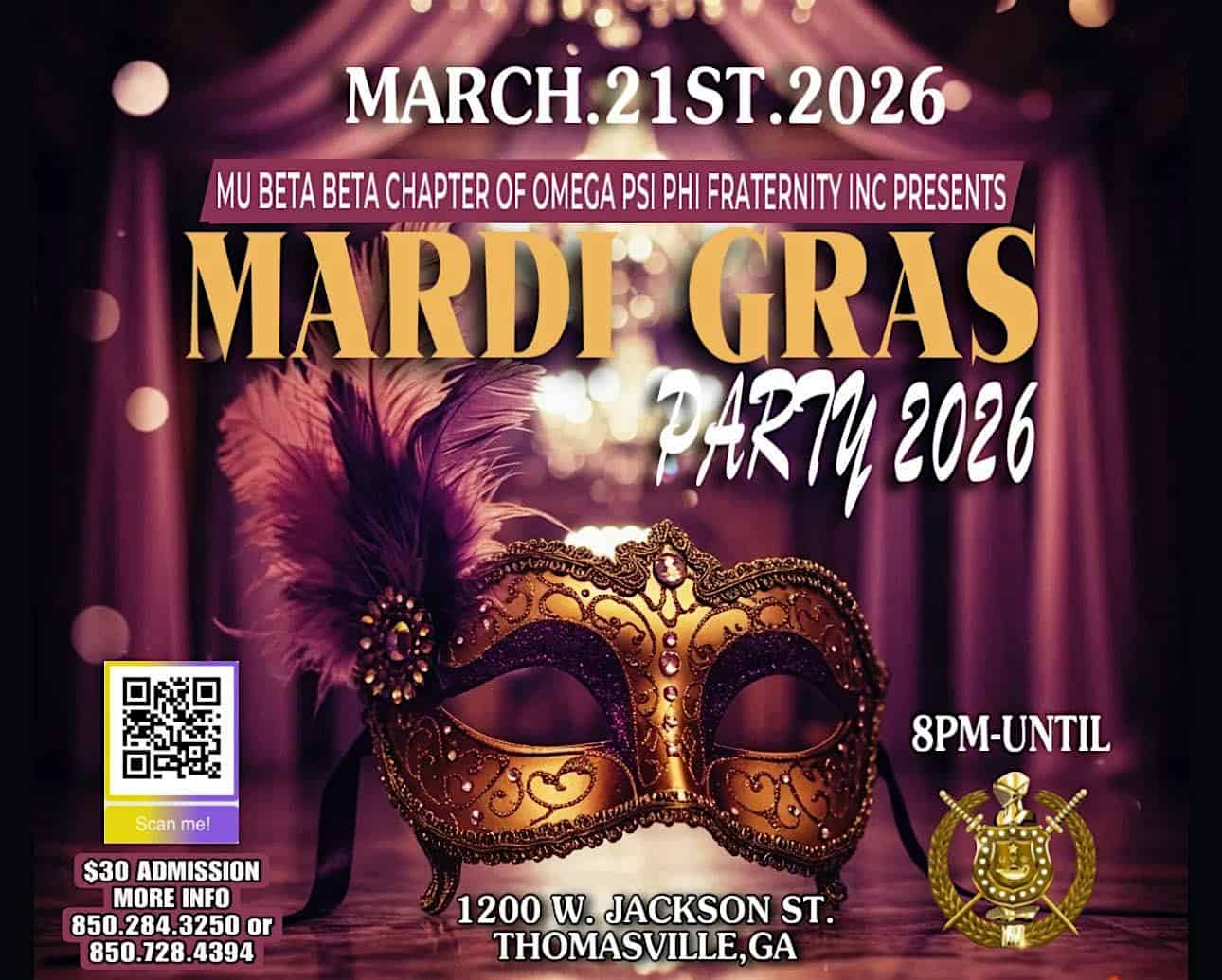 by admin23Feb Mu Beta Beta Presents: Omega Mardi Gras 2026 at Receptions For You – Thomasville, GA Mu Beta Beta Presents: Omega Mardi Gras 2026 at Receptions For You – Thomasville, GA 1 1 people viewed this event. Mu Beta Beta Chapter of Omega Psi Phi, Fraternity, Inc., presents Mardi Gras Party 2026. Join us for music, vibes, and Mardi Gras flair. Tickets-RSVP Link Date And Time Saturday, March 21st, 2026 08:00 PM (PST) Venue Receptions For You Location 1200 West Jackson Street, Thomasville, GA 31792 Event Types Community & CultureParty or Social Gathering Event Category Georgia Share With Friends Facebook Twitter Linkedin Xing Pinterest Share This Post: